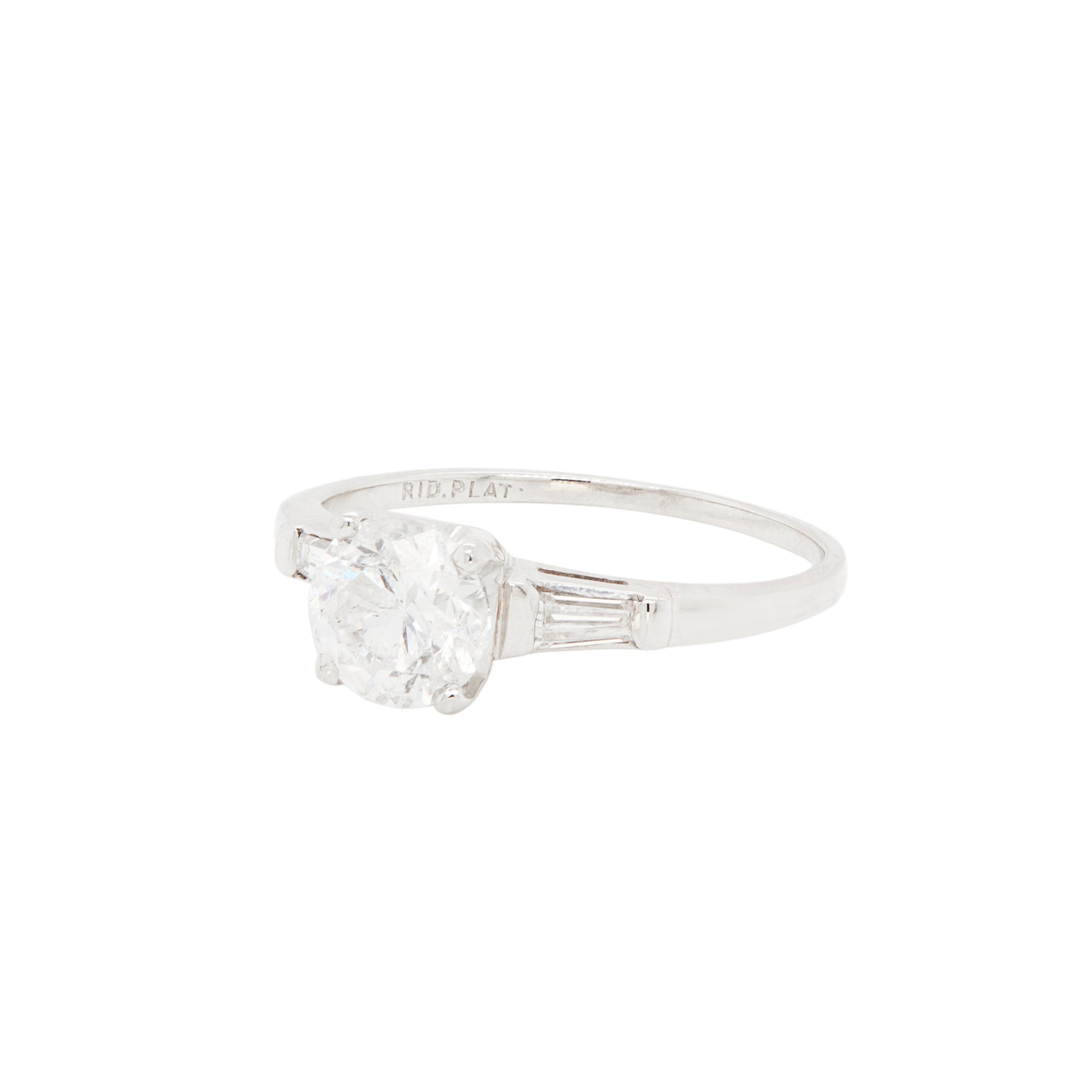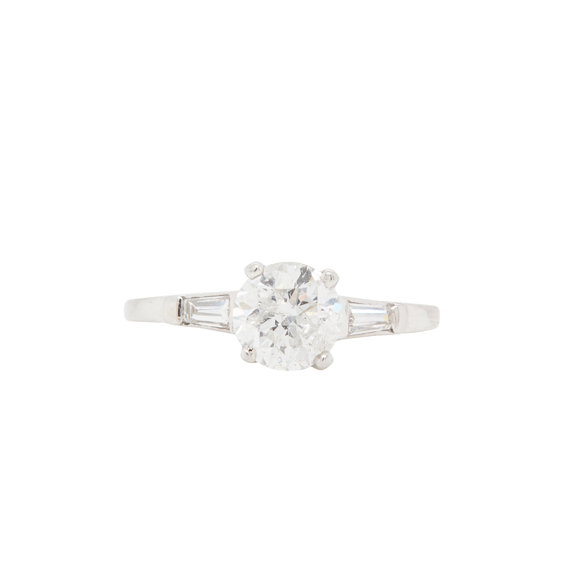 This centre stone is accompanied by 2 tapered baguette cut diamonds, one on either side, with an estimated combined weight of 0.20ct.