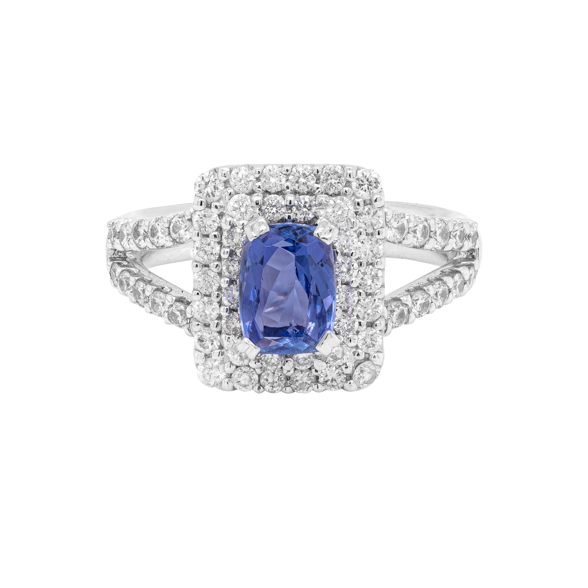 This exquisite 18 carat white gold engagement ring features a wonderful 1.13ct cushion shaped tanzanite mounted in a four claw, open back setting. The vivid stone is surrounded by a rectangular double halo of 38 round brilliant cut diamonds, highlighting the unique hues of the centre stone. Finally, the beautiful cluster sits atop a split shoulder shank inlaid with 28 round brilliant cut diamonds, bringing the total diamond weight to 0.95ct. Stamped D 0.95. UK finger size 'M'.