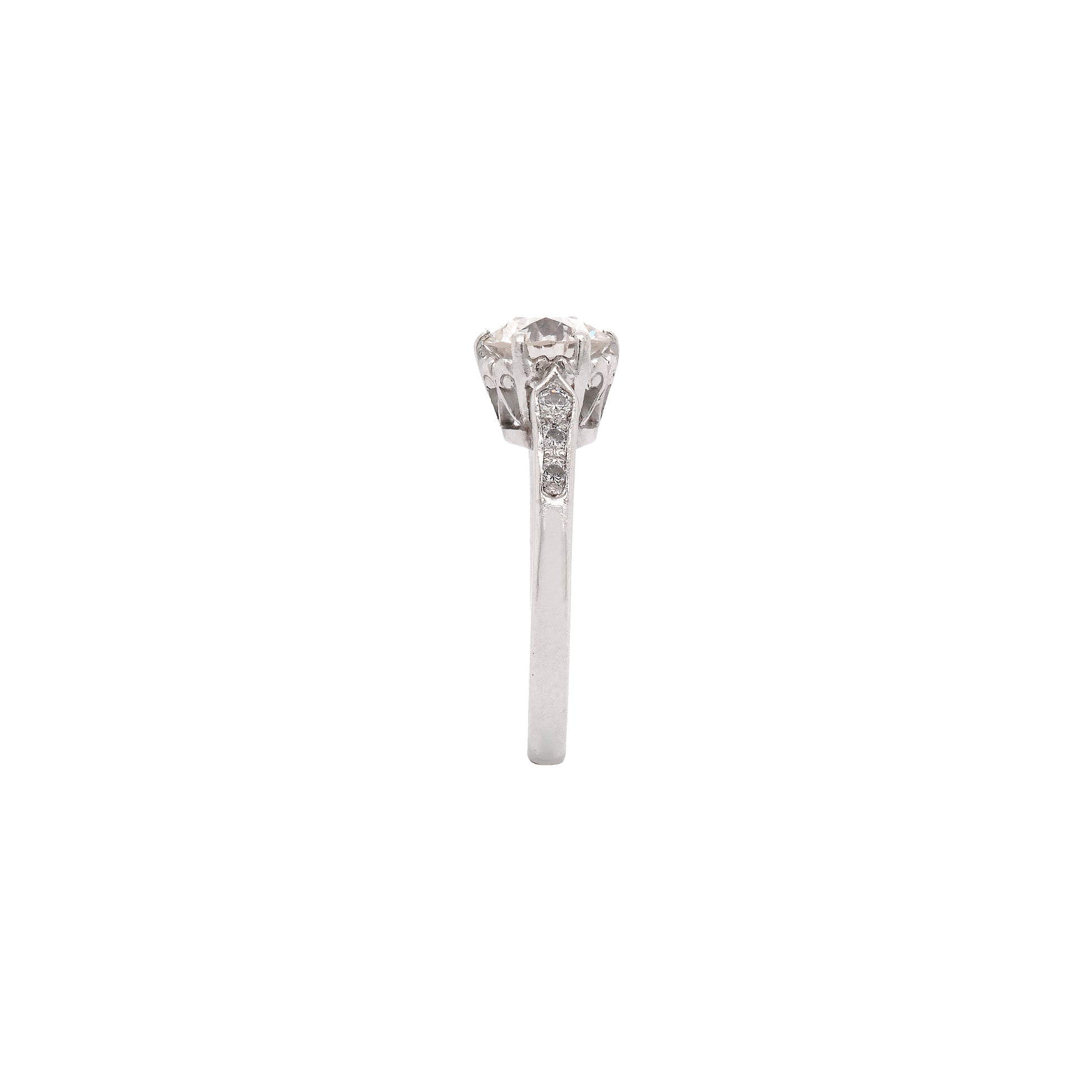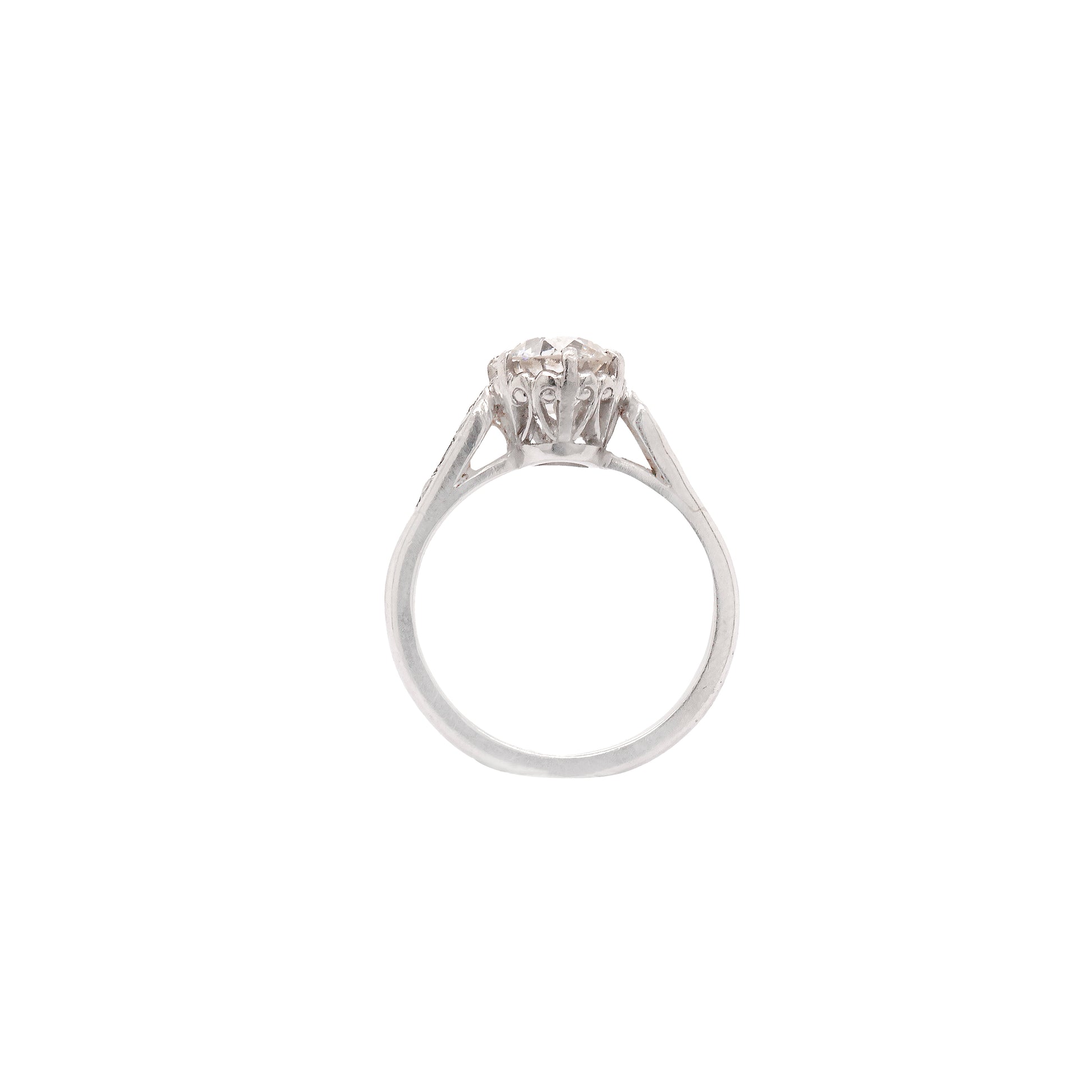 Crafted with care, this elegant engagement ring features a wonderful 1.18ct semi old cut diamond, secured in a six claw, open back platinum collet.