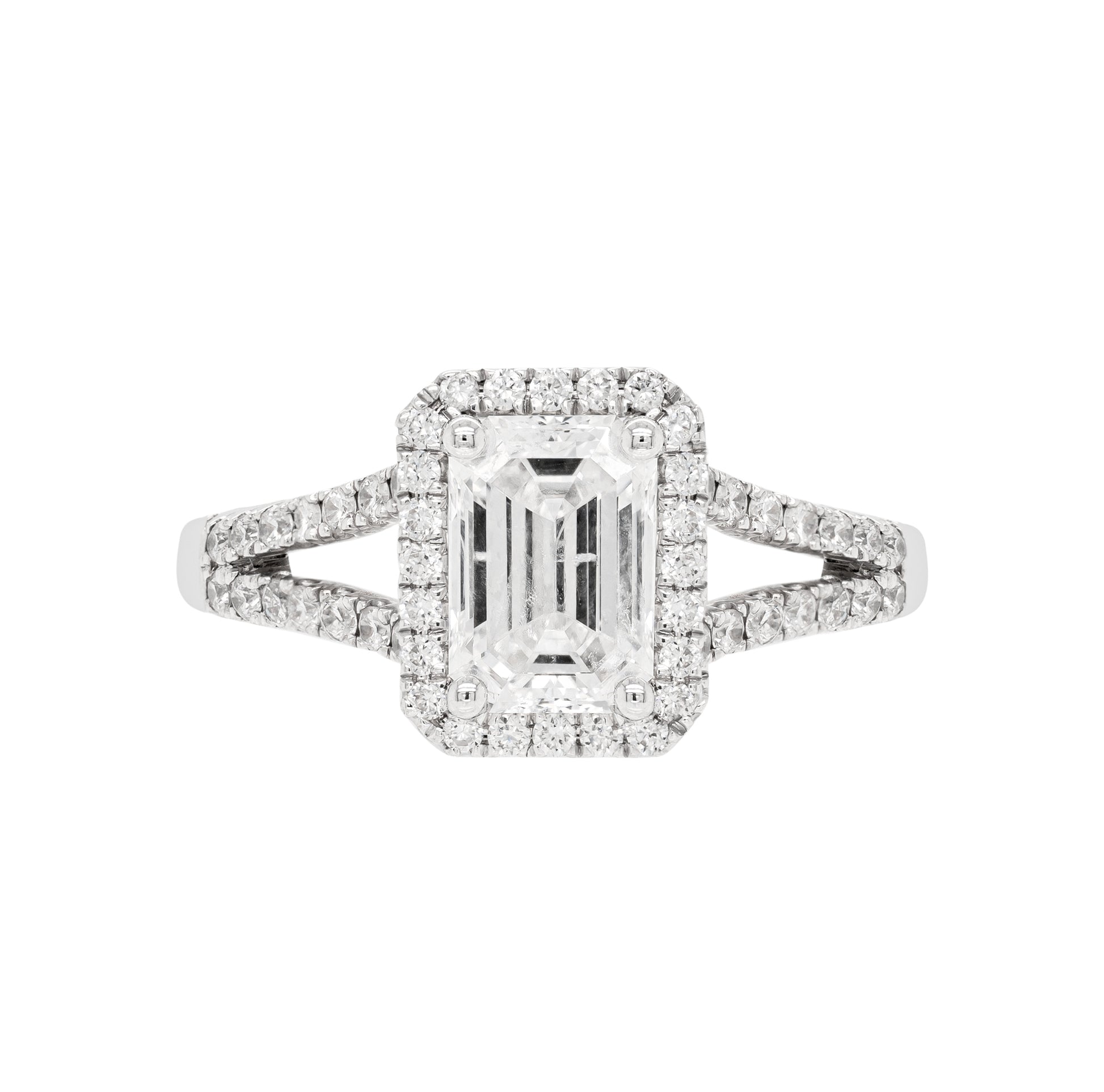 This elegant engagement ring features a GIA certified 1.20 carat emerald cut diamond, graded H, SI2. The gorgeous stone is beautifully surrounded by a halo of round brilliant cut diamonds sat atop a diamond set split shank making the total diamond weight 0.31ct, all mounted in 18 carat white gold. UK finger size 'M'.