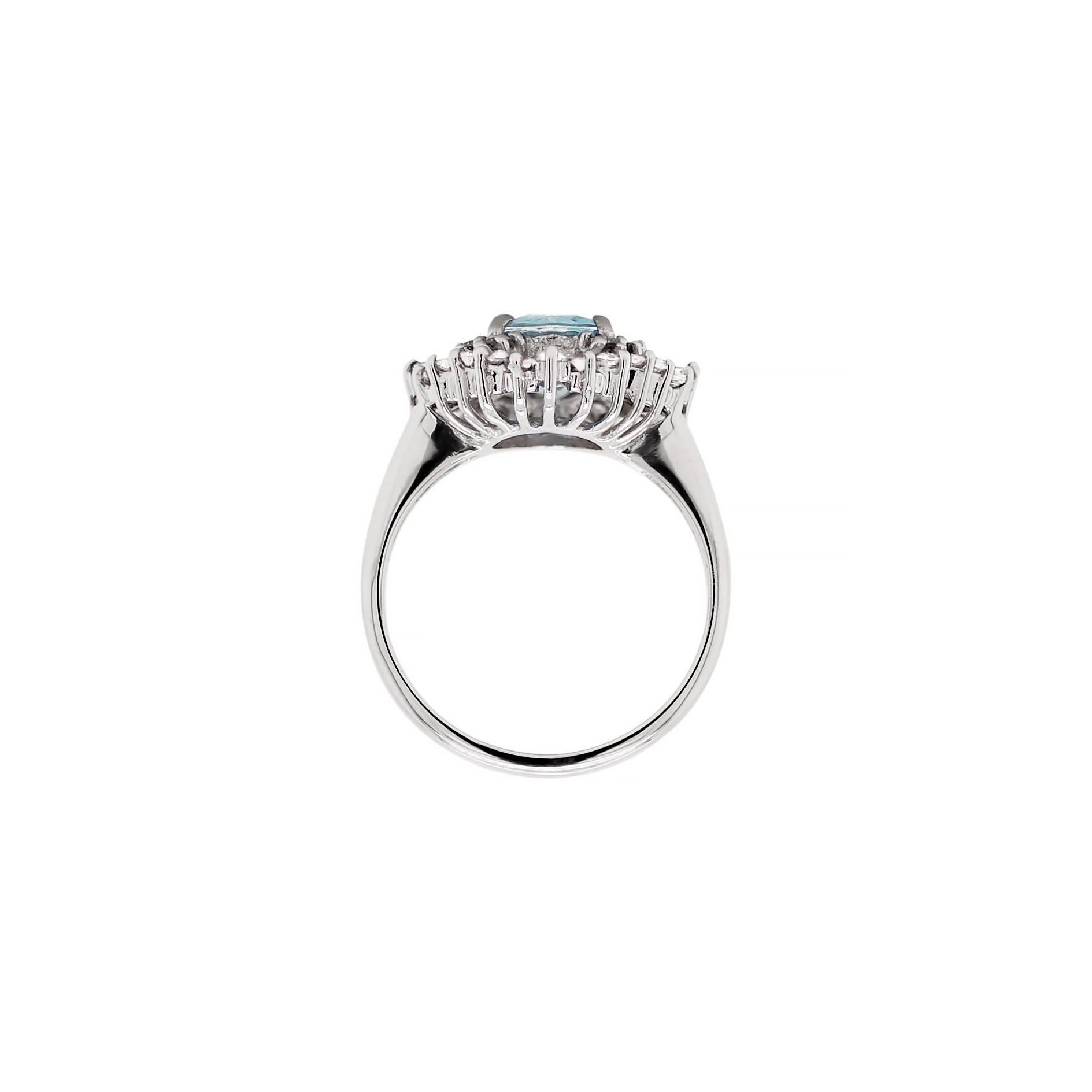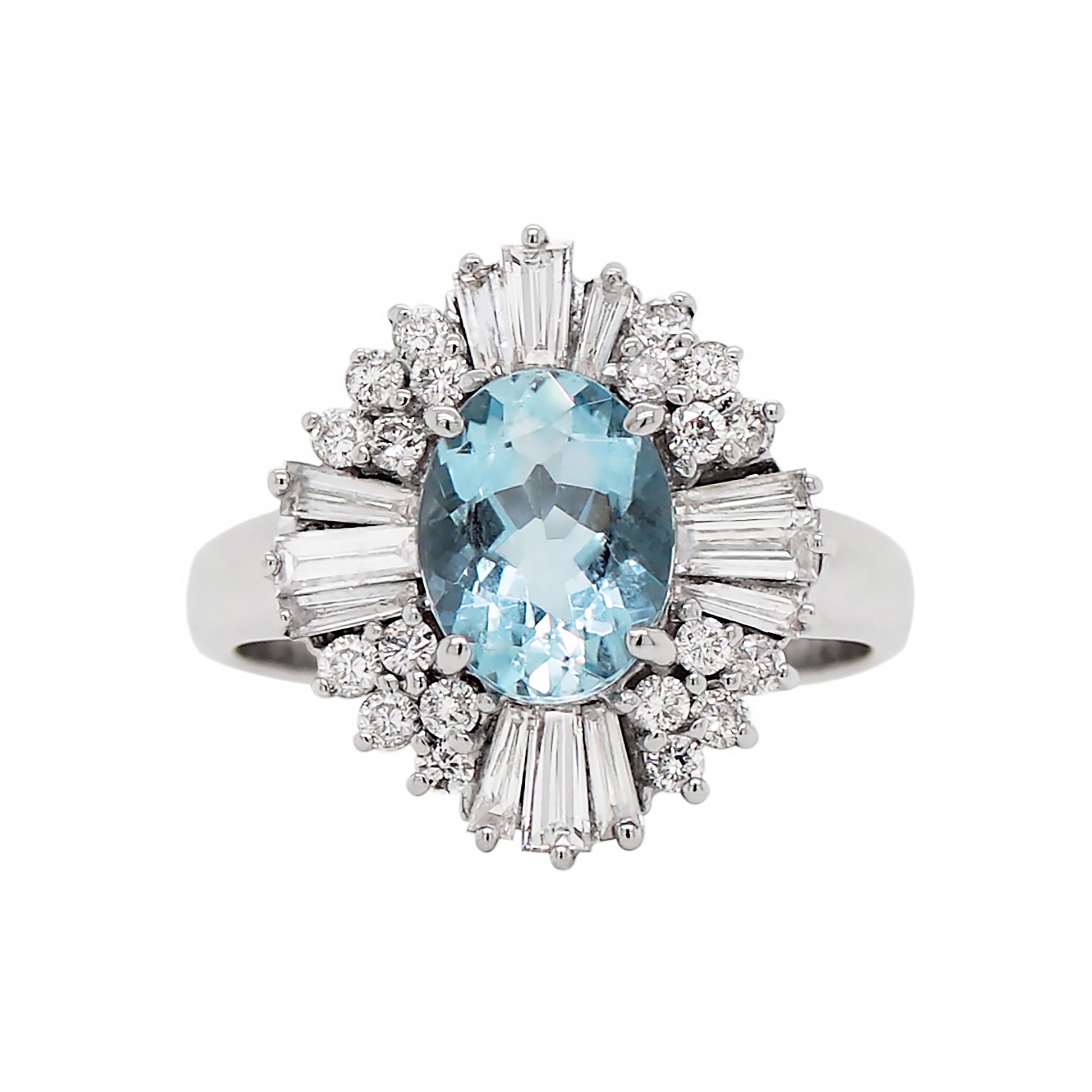 This classic ballerina cluster ring features a beautiful oval aquamarine weighing 1.29ct mounted in a four claw open back setting. The aquamarine is wonderfully surrounded by a mix of tapered banquette cut diamonds and round brilliant cut diamonds weighing a total of 1.00ct, all claw set in 18 carat white gold. UK finger size 'K'.