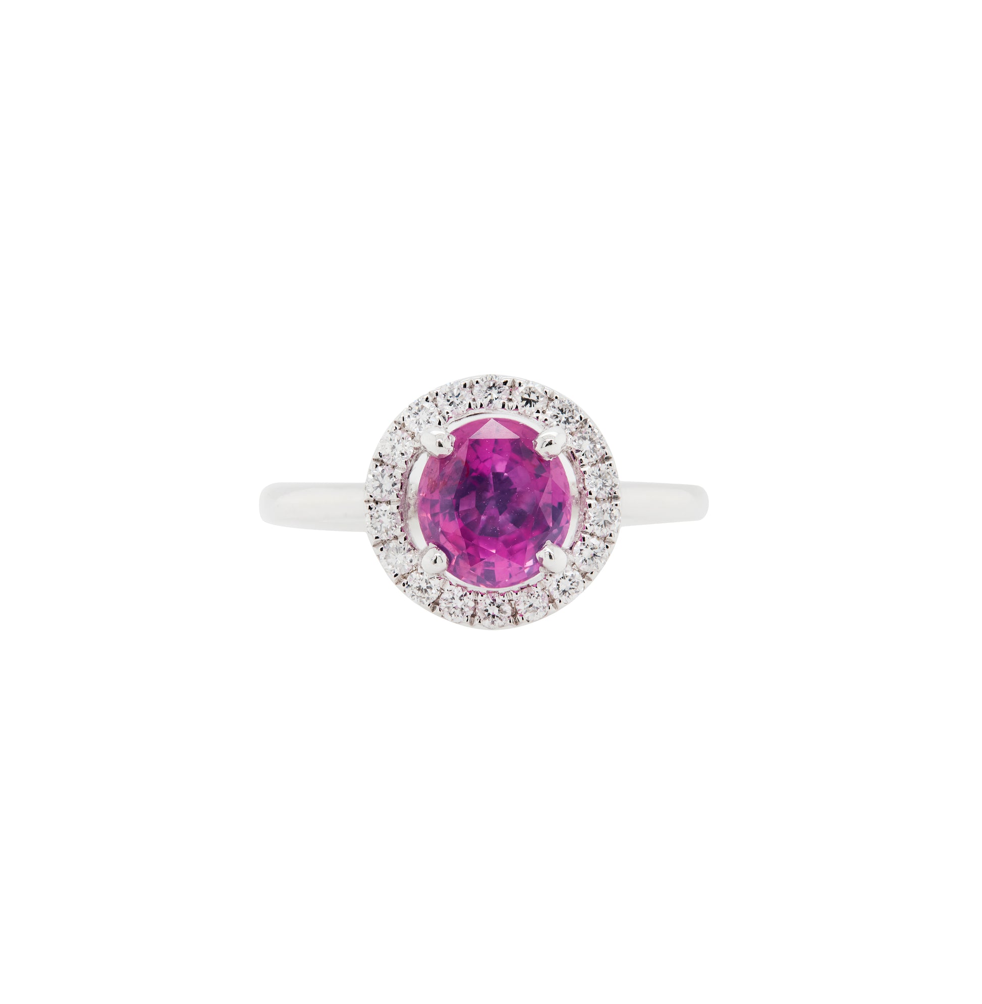 At the centre of this exquisite piece sits a 1.54ct vibrant pink round sapphire, glowing with rich colour and warmth, and securely mounted in a classic four claw, open back setting.