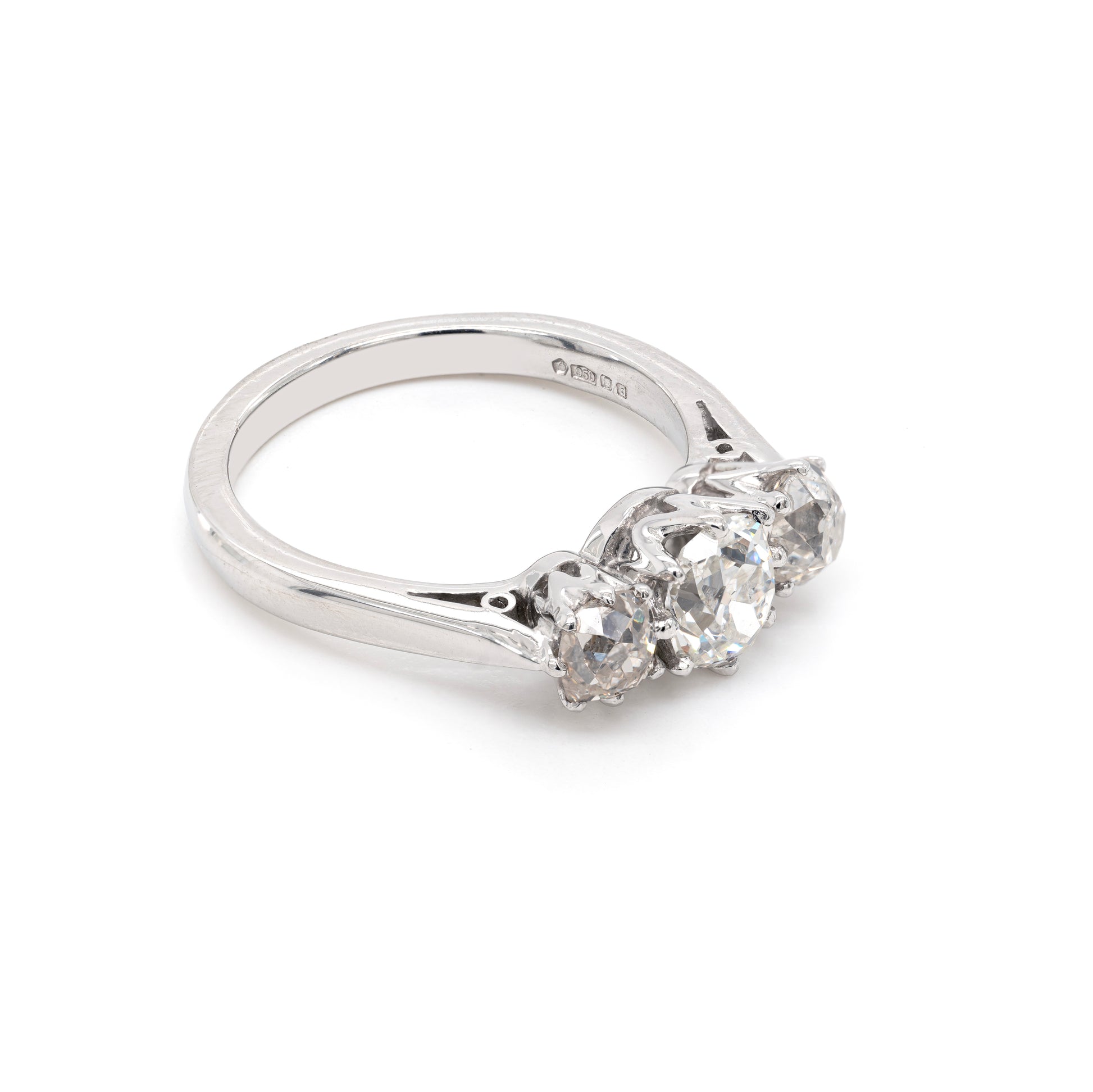 This exquisite platinum engagement ring is beautifully set with a trio of Victorian old cut diamonds, the centre stone weighing 0.71ct and the side ones 0.85ct combined. All three diamonds are mounted in eight claw, open back settings, on a fine and modern ring crafted in 2004. Bringing the three old cut diamonds into the contemporary era by mounting them on a modern and classic ring, transforms this piece into a truly timeless one. Stamped 950, English hallmark. UK finger size 'K'.
