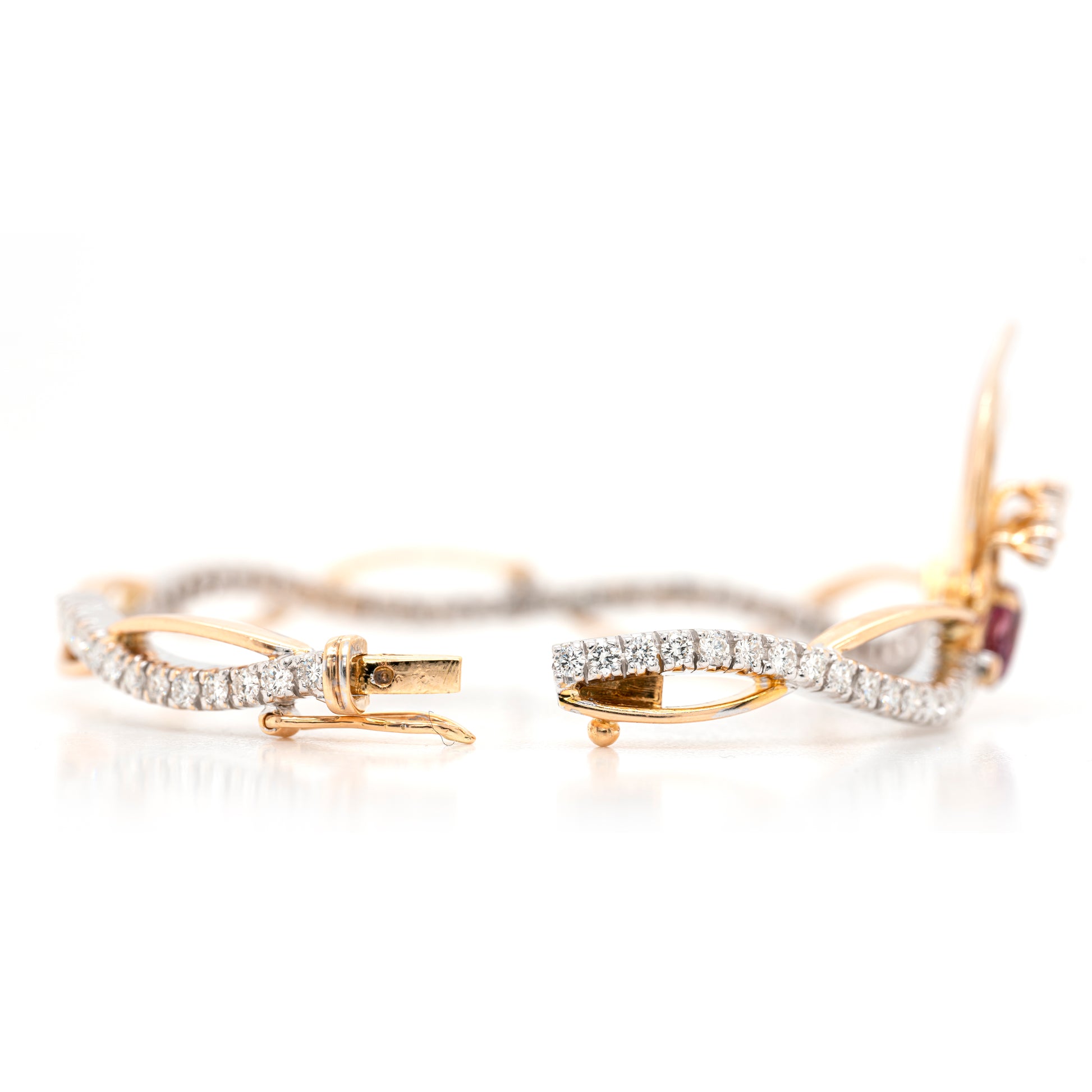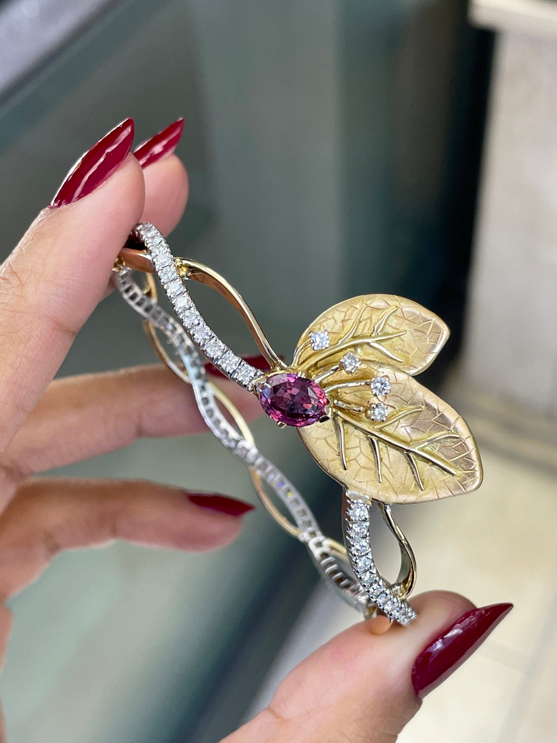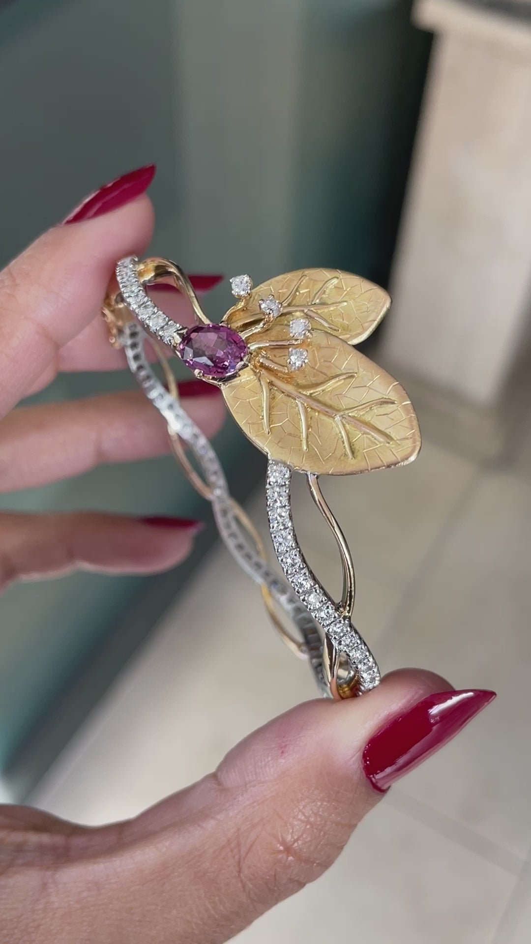1.66 Carat Pink Tourmaline and Diamond 18 Carat White & Yellow Gold Leaf Bangle