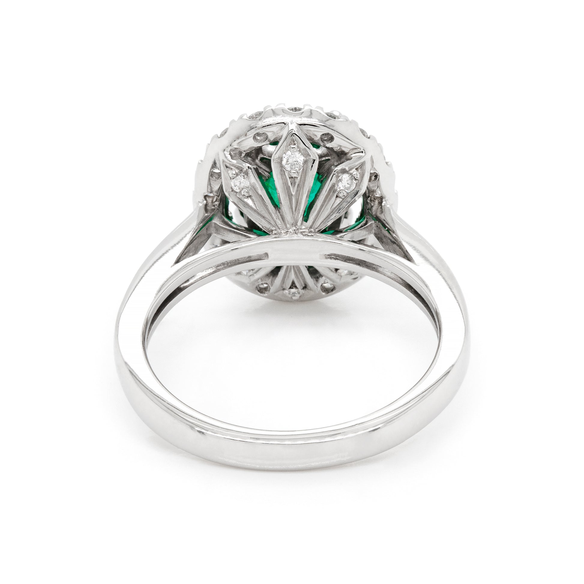Lovely cluster engagement ring featuring a 1.83ct oval shaped emerald, in an open back, four double claw setting. The beautiful emerald is surrounded by a halo inlaid with eighteen claw set fine round brilliant cut diamonds with a total weight of 0.40ct, all mounted in platinum. A floral designed collet, set with six round brilliant cut diamonds, completes this beautiful piece. England, 2014. Hallmarked 950, stamped PT950. UK finger size 'K'.
