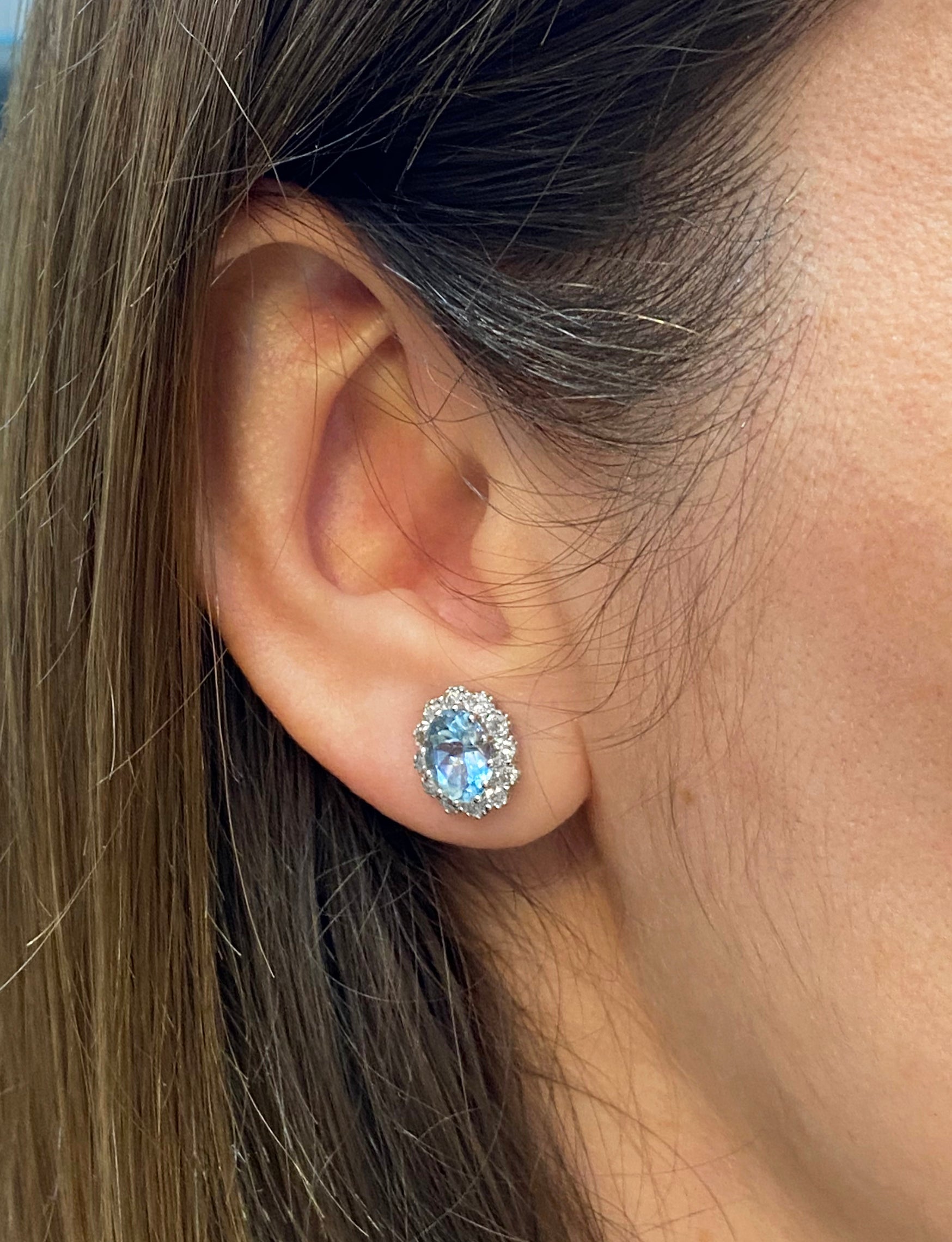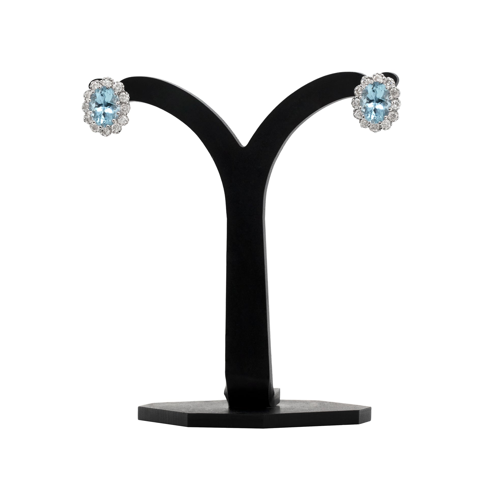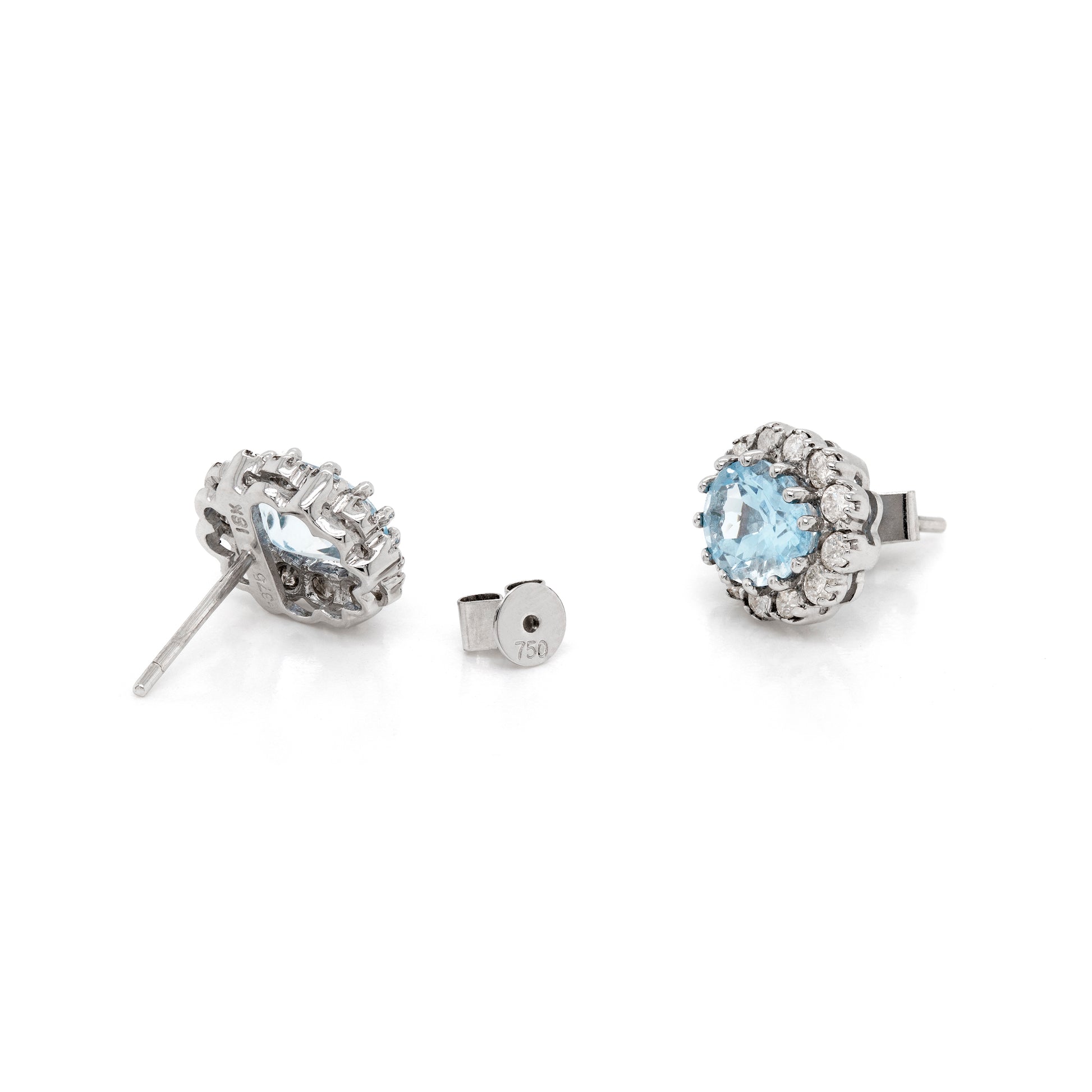 These lovely cluster stud earrings feature an oval aquamarine weighing 1.98ct combined, mounted in a claw open back setting. The beautiful aquamarine is surrounded by twelve claw set round brilliant cut diamonds weighing a total of 0.75ct, all mounted in 18 carat white gold. England, 2013. Hallmarked 750, stamped 18K.
