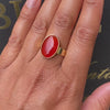 This gorgeous oval shaped carnelian ring is elegantly crafted in 14ct yellow gold. The stone is beautifully set in a simple rub-over setting, and mounted on a plain band which tapers to the back. This is a sleek and timeless ring that is perfect for everyday wear, or as a dress ring. It is currently UK size T, but could be resized.