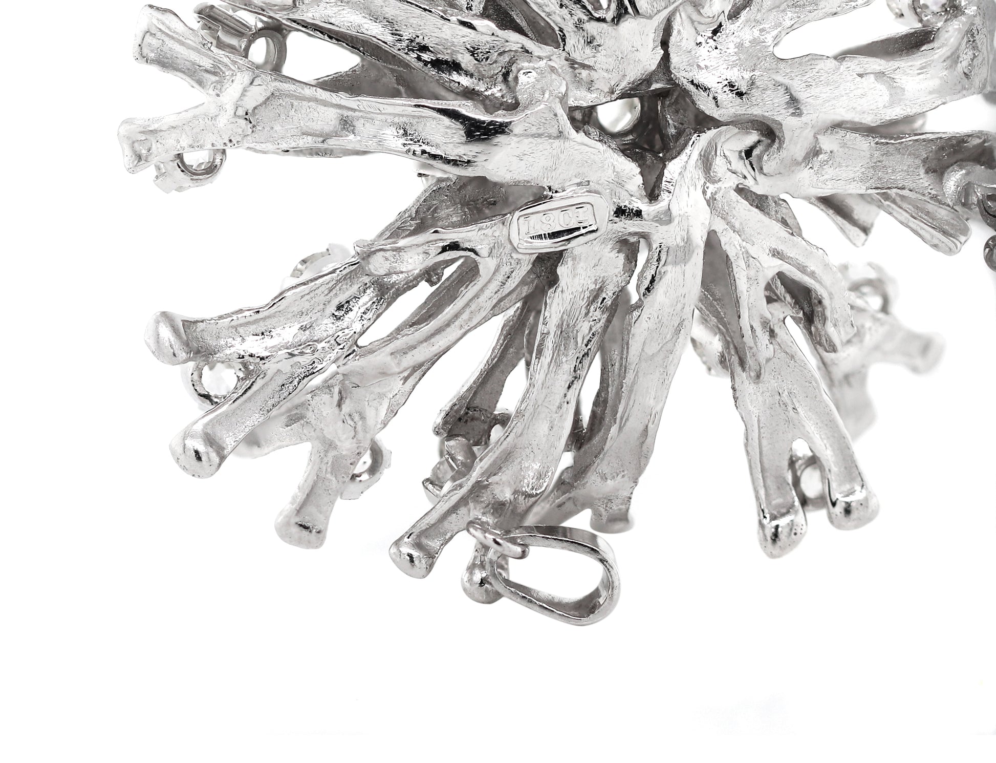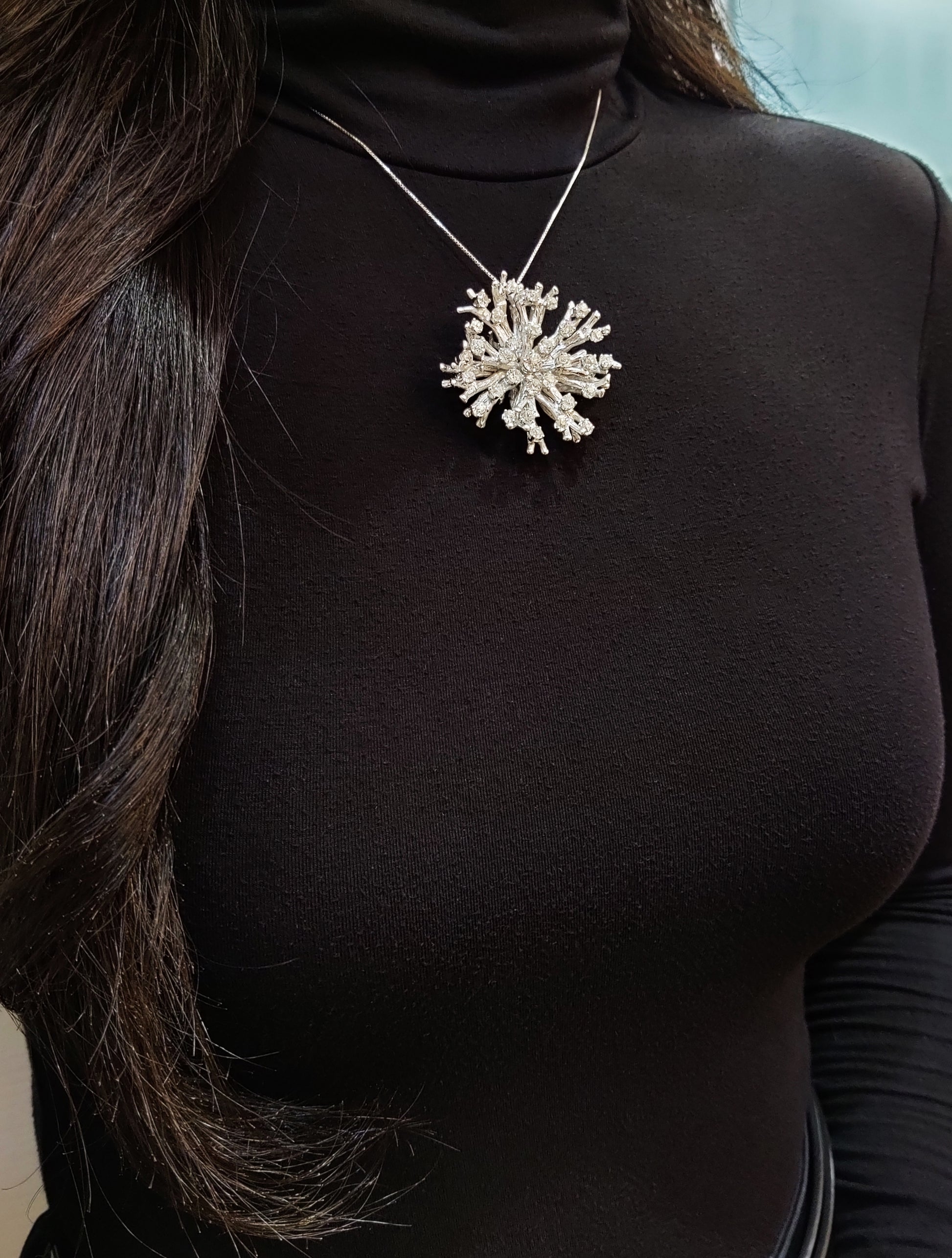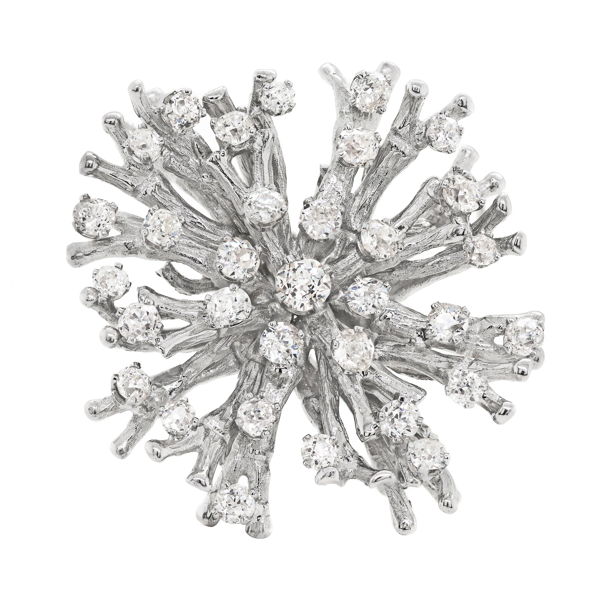 This unique Vintage coral design brooch was handmade from solid 18 carat white gold. The piece is beautifully claw set with a cluster of 33 old mine cut diamonds weighing an approximate total weight of 5.50 carats. Created to wear as both a brooch and a pendant, fitted with an 18ct gold bail and brooch pin. Stamped 18CT. England, circa 1960's.