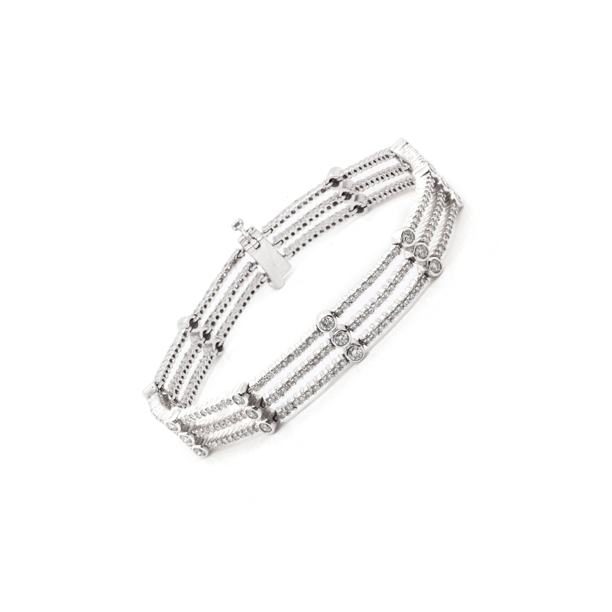 The bracelet features three rows of delicate 18 carat white gold diamond set bar links, masterfully joined together to beautifully curve around the wrist, creating a continuous luxurious sparkle. These bar links are expertly connected to each other through elegant vertical links that are rubover set with 3 striking round brilliant cut diamonds, bringing the carat weight to approximately 4.00ct combined.
