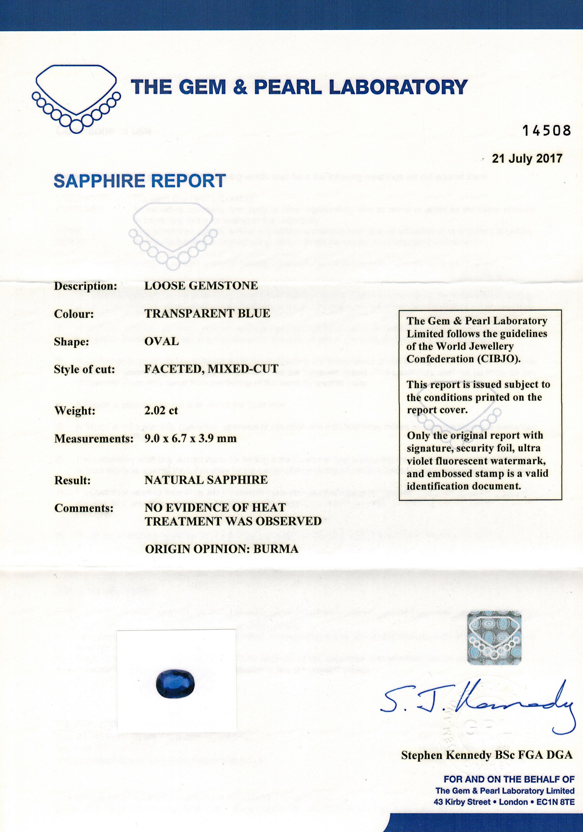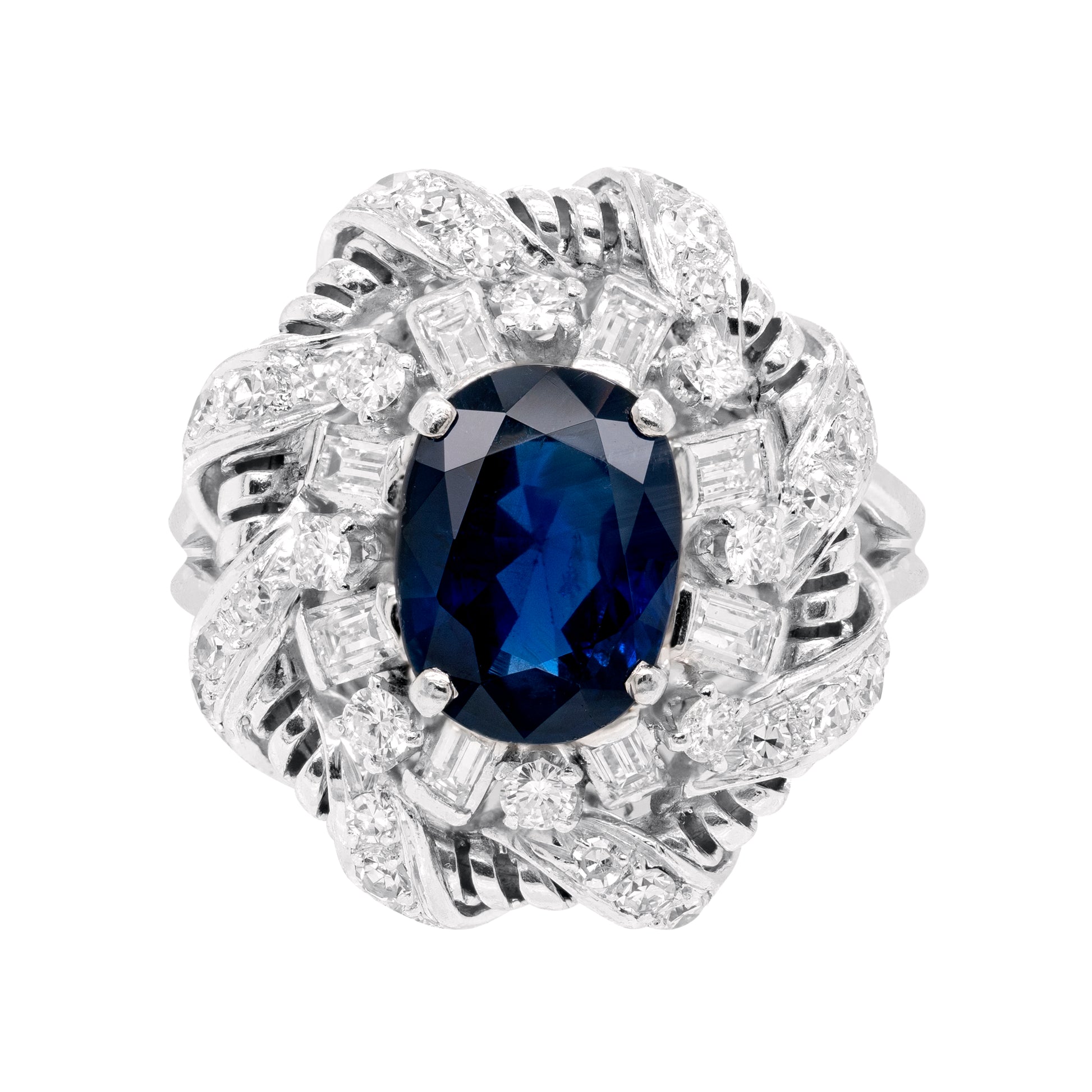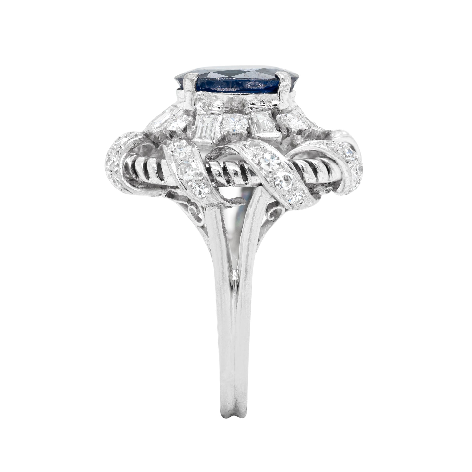 This wonderful vintage platinum cluster ring features a natural royal blue oval sapphire weighing 2.02ct in a four claw, open back setting. The vibrant stone is beautifully surrounded by a row of alternating semi rub-over set baguette cut diamonds and claw set round brilliant cut diamonds. A delicate ribbon inlaid with eight cut diamonds is meticulously twisted around a solid gold spring completing the intricate cluster and bringing the total approximate diamond weight to 1.20ct. Finally, the exquisite cluster sits atop a thin split shoulder shank decorated with swirls on the inside. French hallmark, stamped PT. Circa 1950's. UK finger size 'J'.