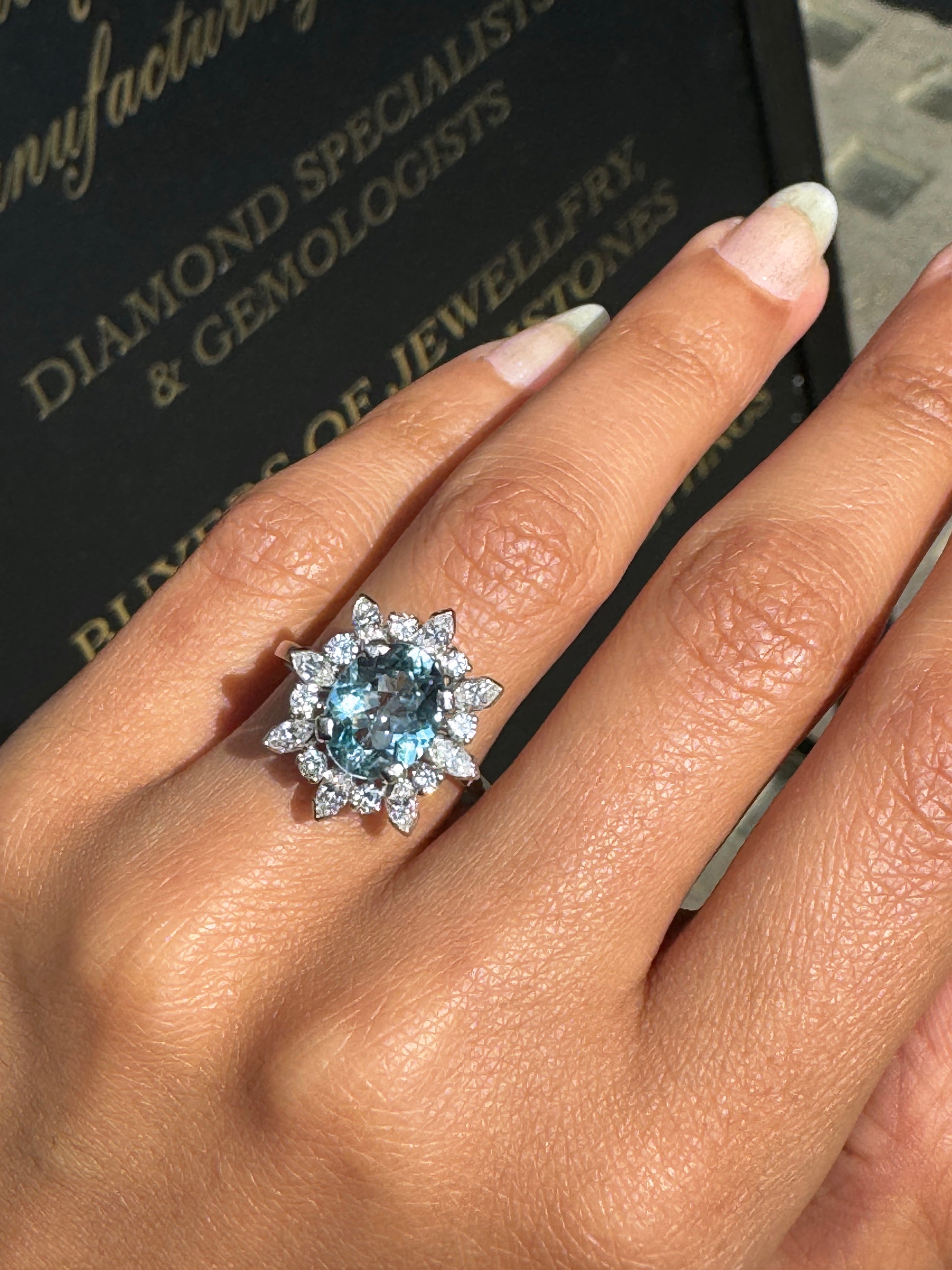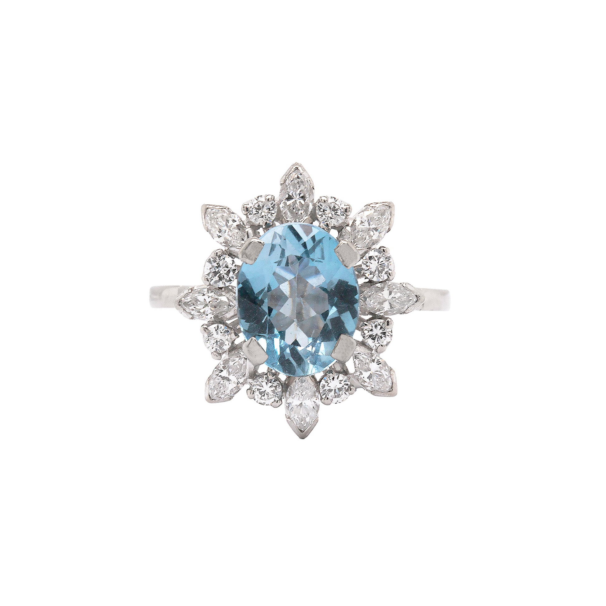 This vintage cluster engagement ring features a vibrant oval aquamarine in the centre weighing 2.61 carats mounted in a four claw, open back setting. The gemstone is perfectly surrounded by alternating marquise and brilliant cut diamonds giving a wonderful contrast to the ocean blue aquamarine.