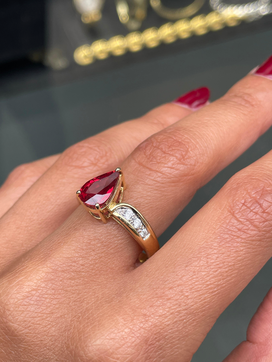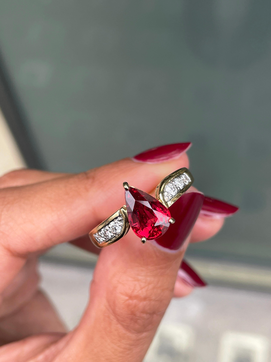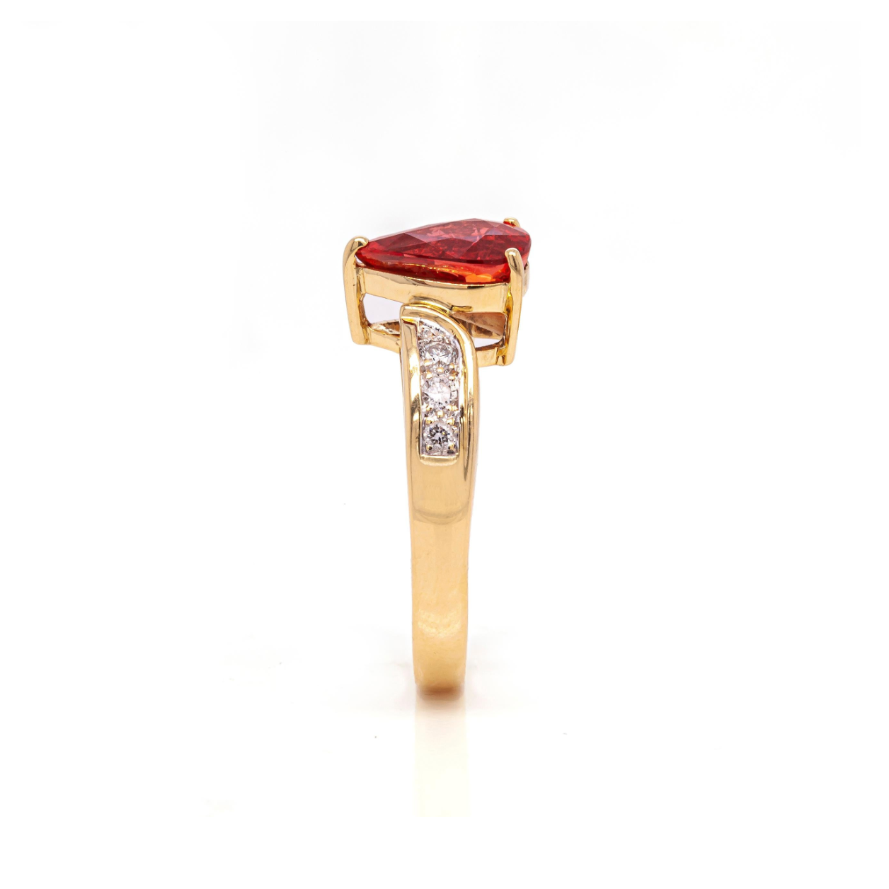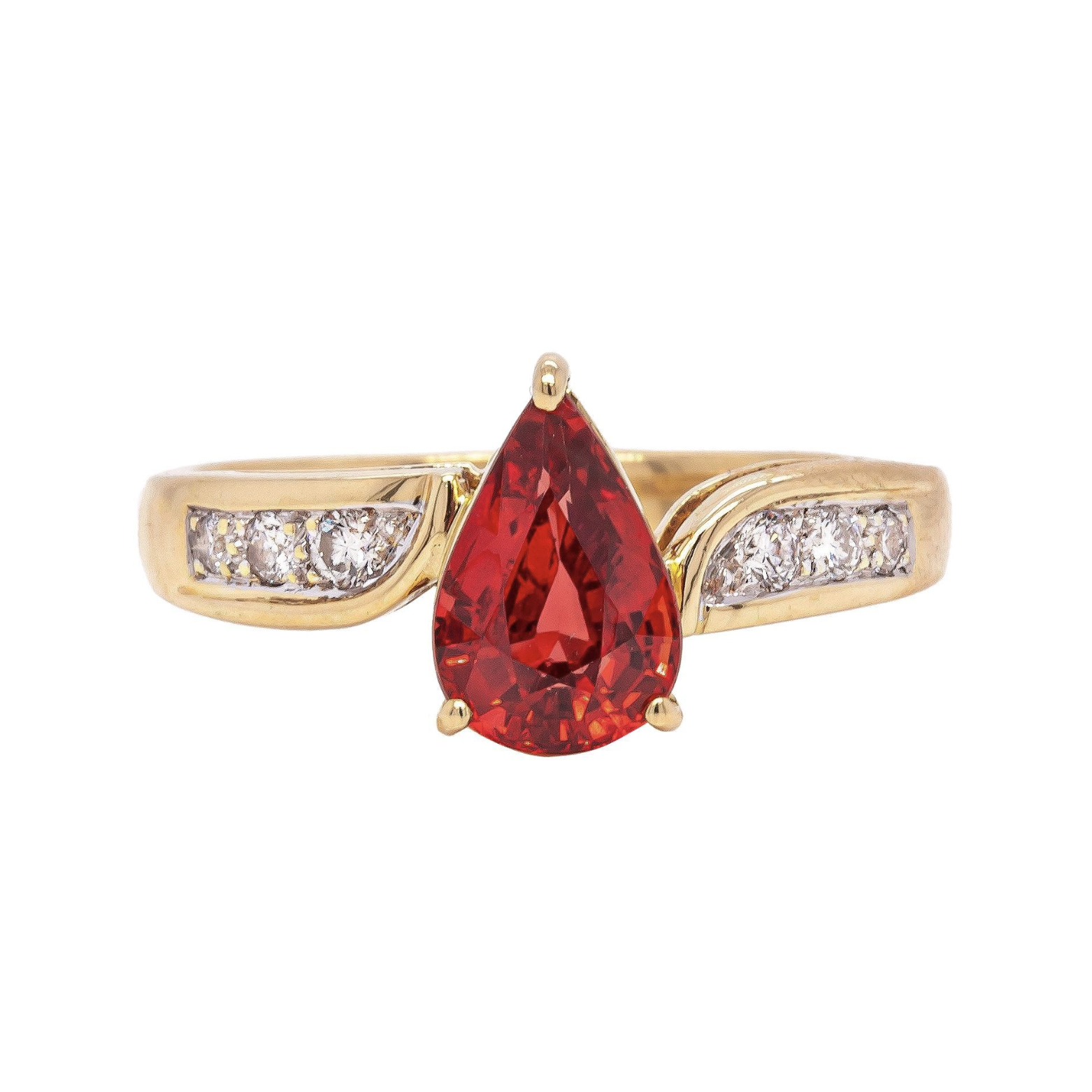 This exquisite engagement ring is beautifully centred with a wonderful reddish-orange pear shape sapphire weighing approximately 2.62ct, mounted in a three claw, open back setting. The ring is further decorated with 3 round brilliant cut diamonds grain set on each shoulder in 18 carat white gold, weighing approximately 0.18ct in total, all sat atop an 18 carat yellow gold shank. Stamped 750. UK finger size 'T'.