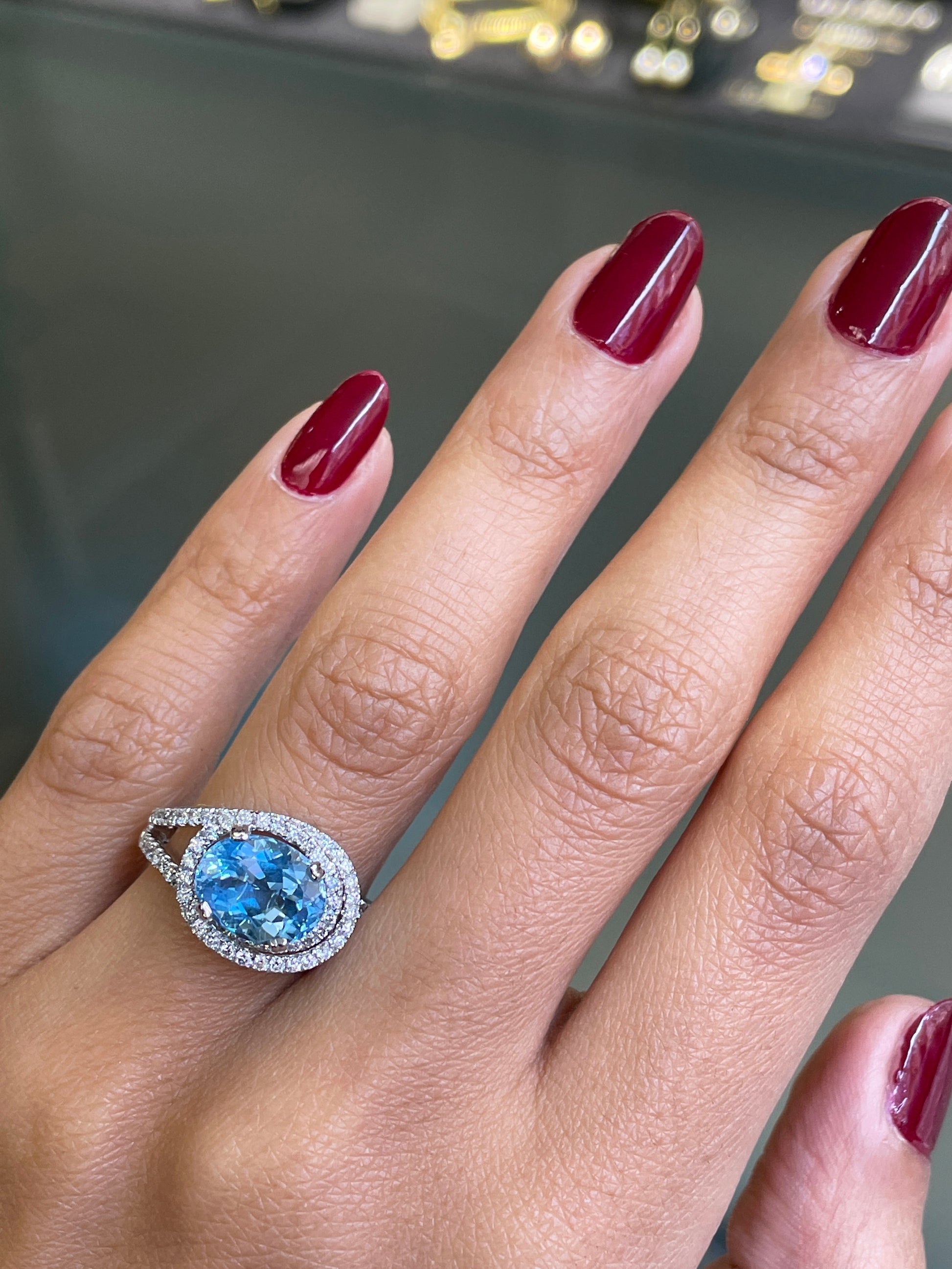 This gorgeous dress ring features a stunning oval aquamarine weighing 2.70ct mounted in a four claw, open back setting, The gemstone is beautifully encased in the centre of a diamond set swirled mount bringing the gemstones colour to life. The unique mount is set with a total of 0.68ct of fine quality round brilliant cut diamonds finished with the band tapering to a plain solid 18ct white gold shank. UK finger size 'M'.