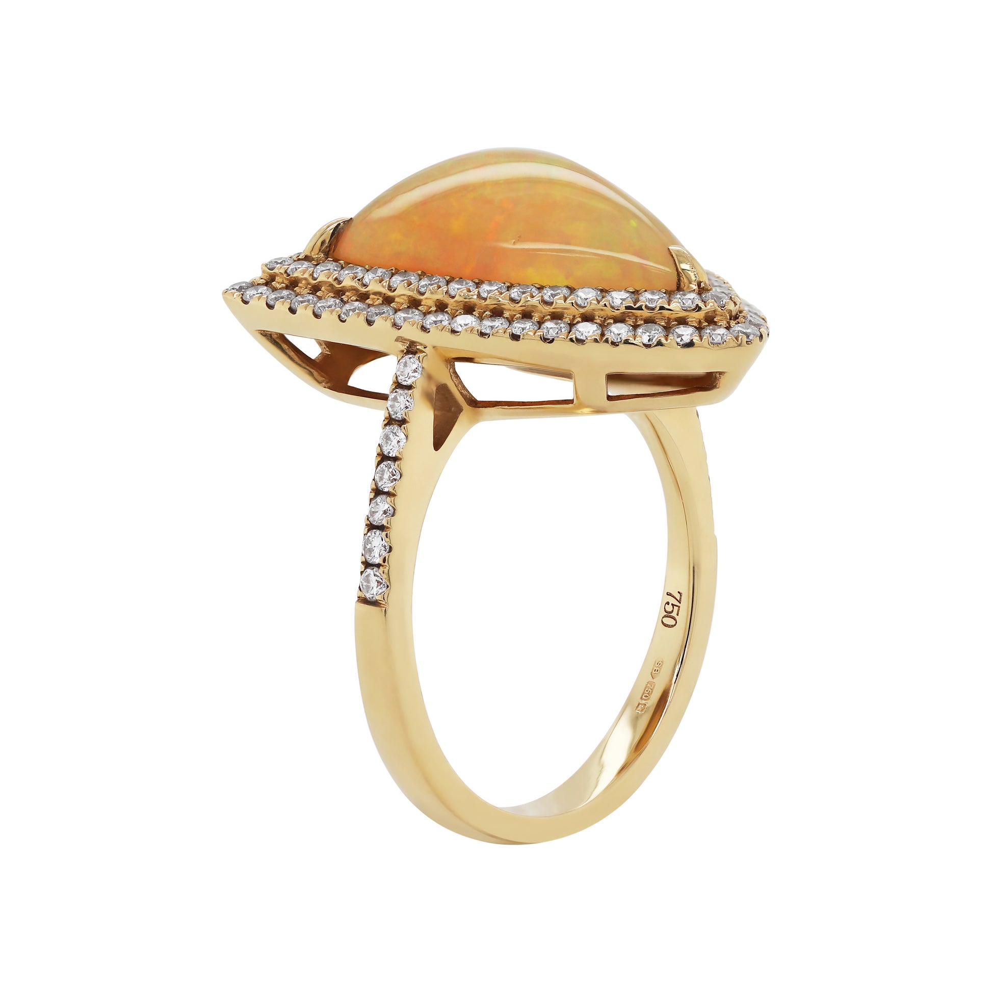 This modern dress ring features a lively trillion shaped cabouchon opal weighing 3.30ct, claw set in an open back mount. The stone is wonderfully surrounded by a double halo of fine quality round brilliant cut diamonds, mounted atop a very fine gold shank set with diamond shoulders totaling to a diamond weight of 0.69ct, all mounted in 18 carat yellow gold. Hallmarked and stamped 750, O3.30 D0.69. UK finger size 'N'.