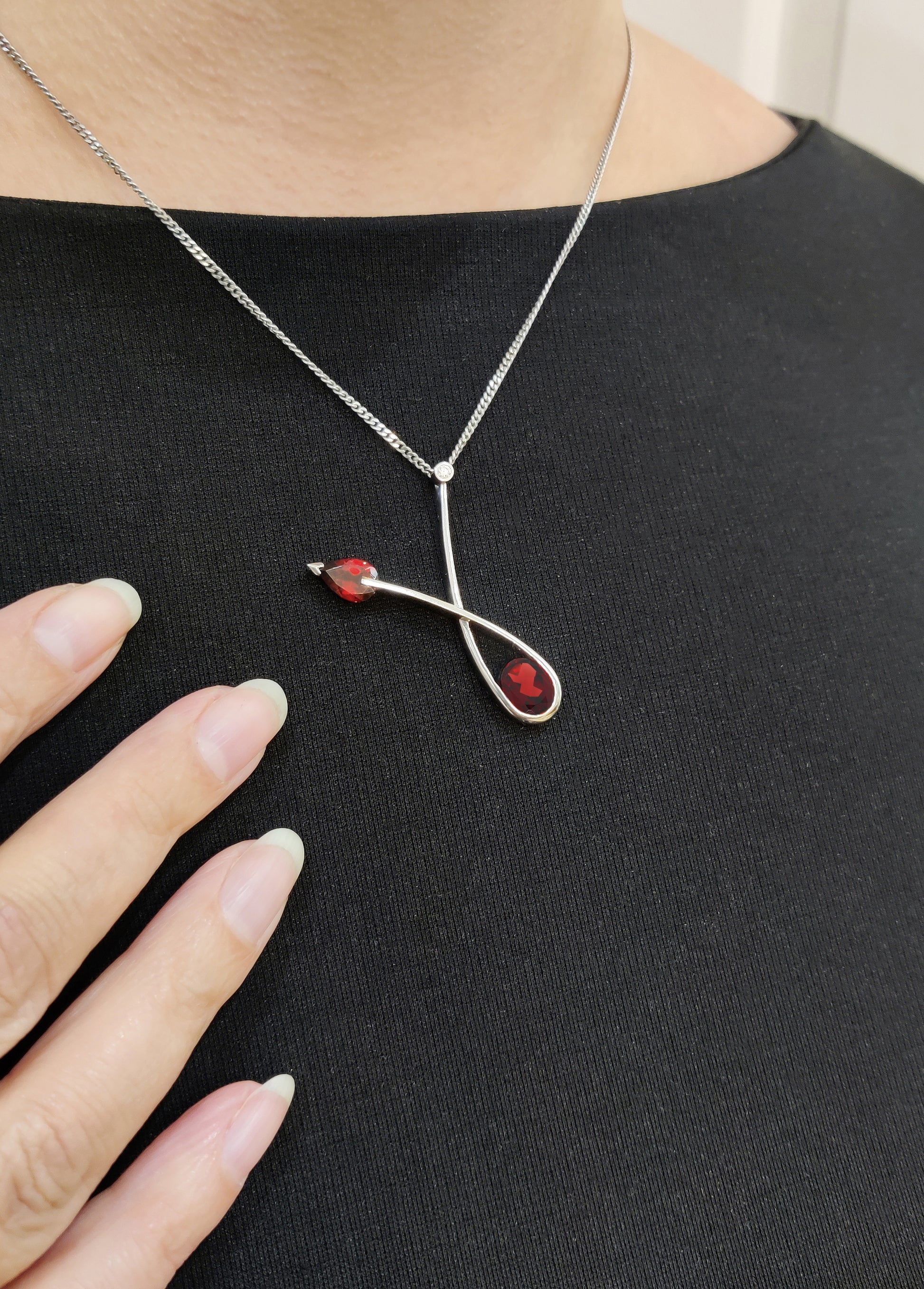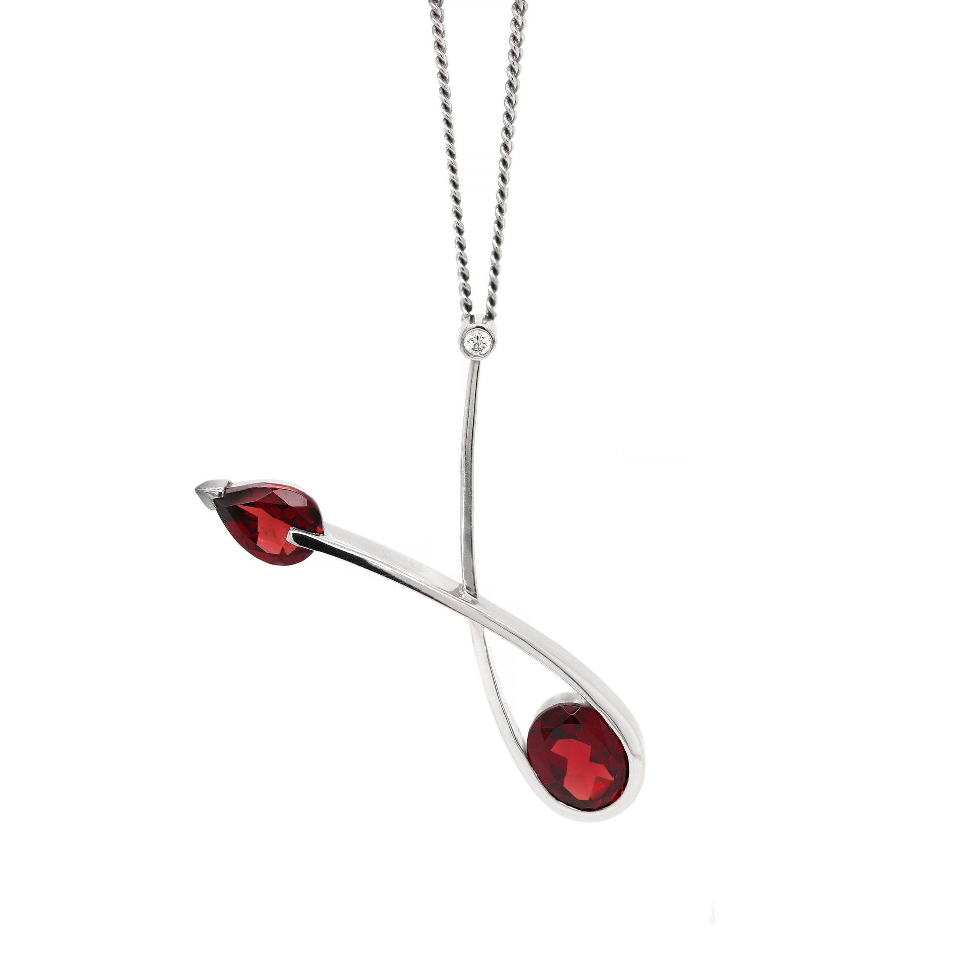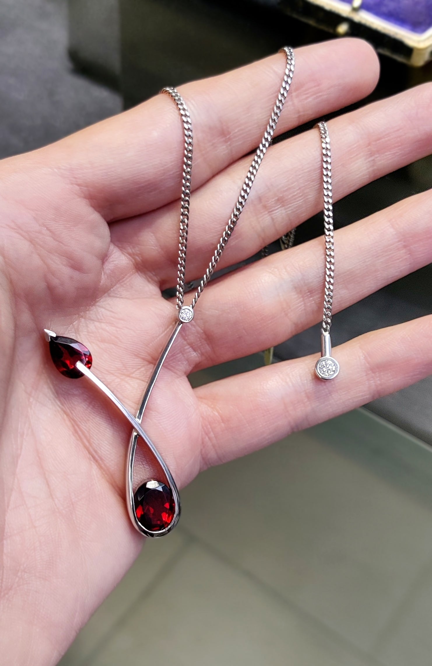 This lovely hand made necklace features an abstract loop platinum pendant, set with a pear shaped and an oval dark red garnet, coming to a combined approximate weight of 5.16 carats and a round brilliant cut diamond, weighting approximately 0.15ct. The pendant hangs from a fine platinum 15" curb chain fitted with a rub over set round brilliant cut diamond drop at the closure weighing approximately 0.05ct. Hallmarked 950, England.