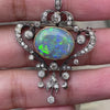 The spectacular opal is beautifully highlighted by 43 old mine cut diamonds, all inlaid on delicate silver on gold curled mounts, weighing approximately 1.00ct combined. England, circa 1880. Tested silver on gold.