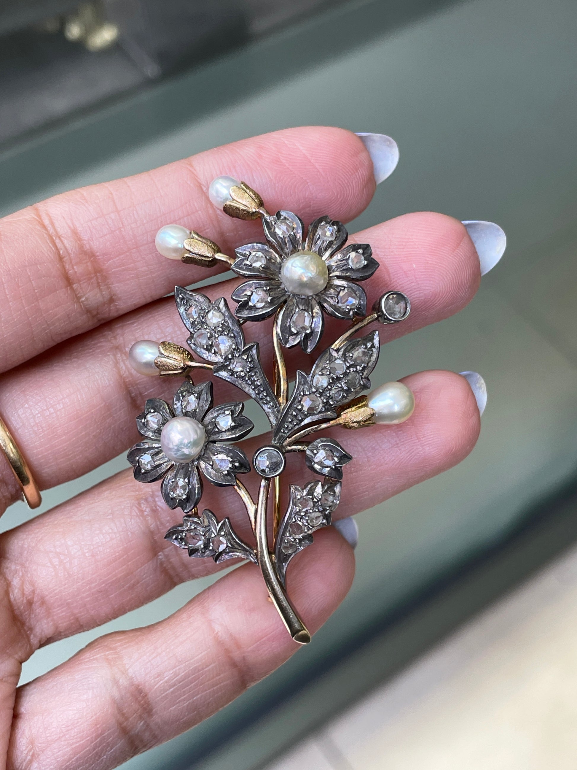 Antique Natural Pearl and Rose Cut Diamond Silver on Gold Floral brooch, c1870's