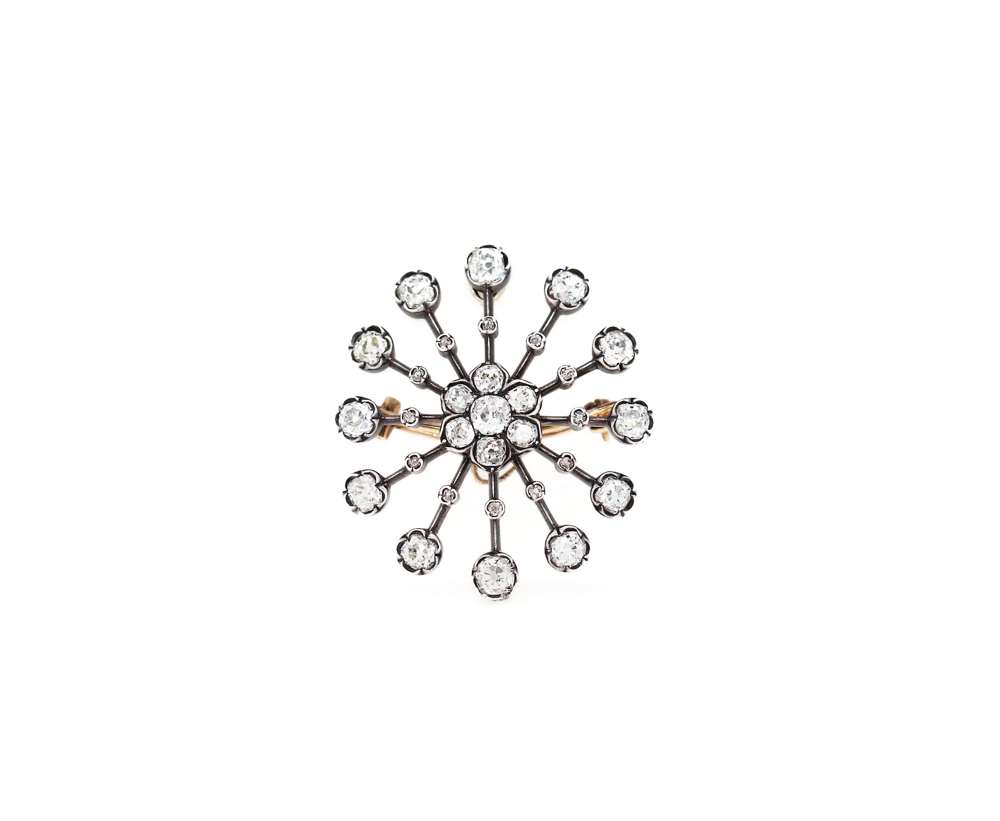 Beautiful antique flower brooch/pendant featuring 31 old mine cut diamonds with a total approximate weight of 5.50ct all set in silver on gold. The piece is fitted with a handmade pin safety catch as well as a jump ring lever attachment to be worn as a pendant. This piece measures 4 x 3.5cm and weighs 10.84 grams. Circa 1880's.