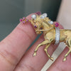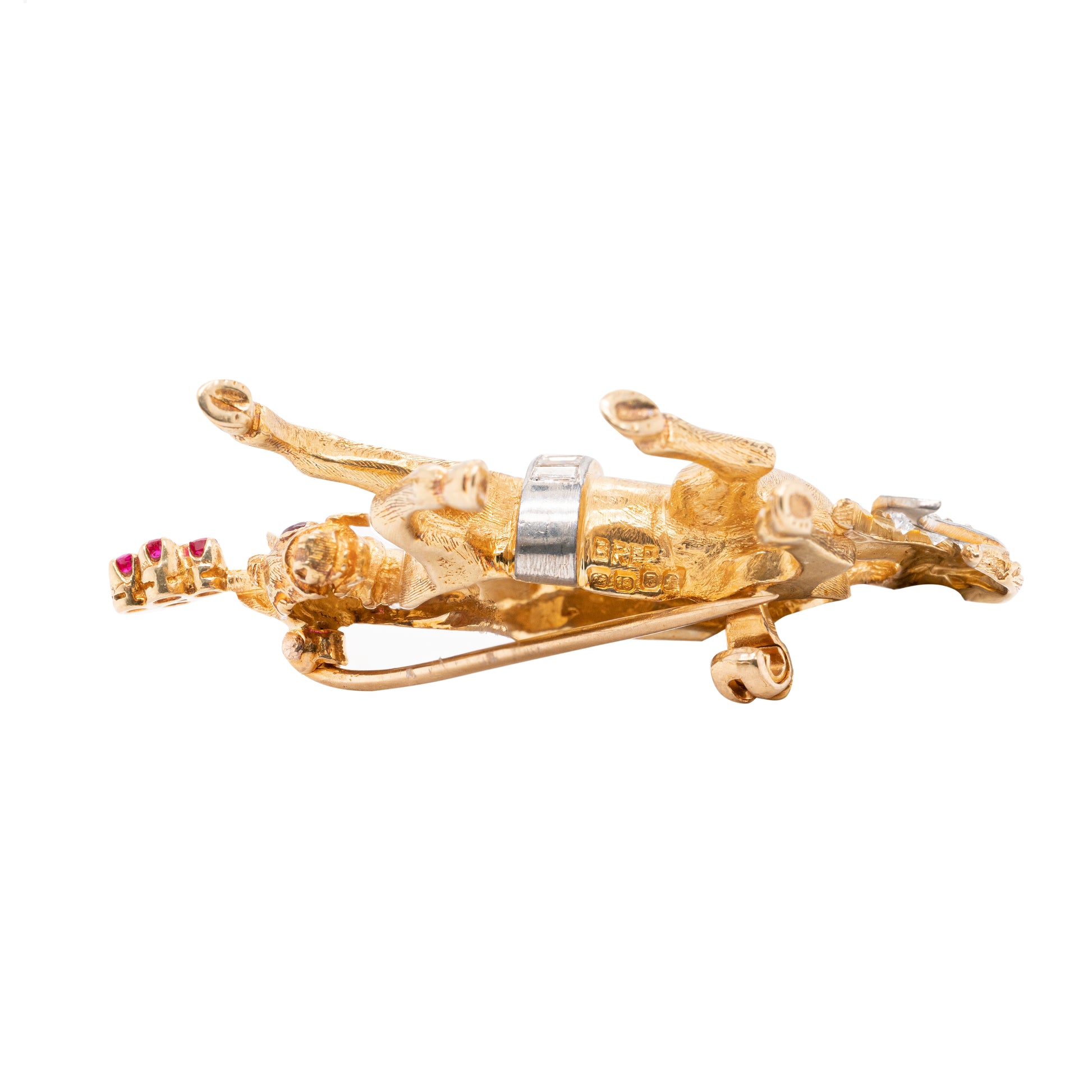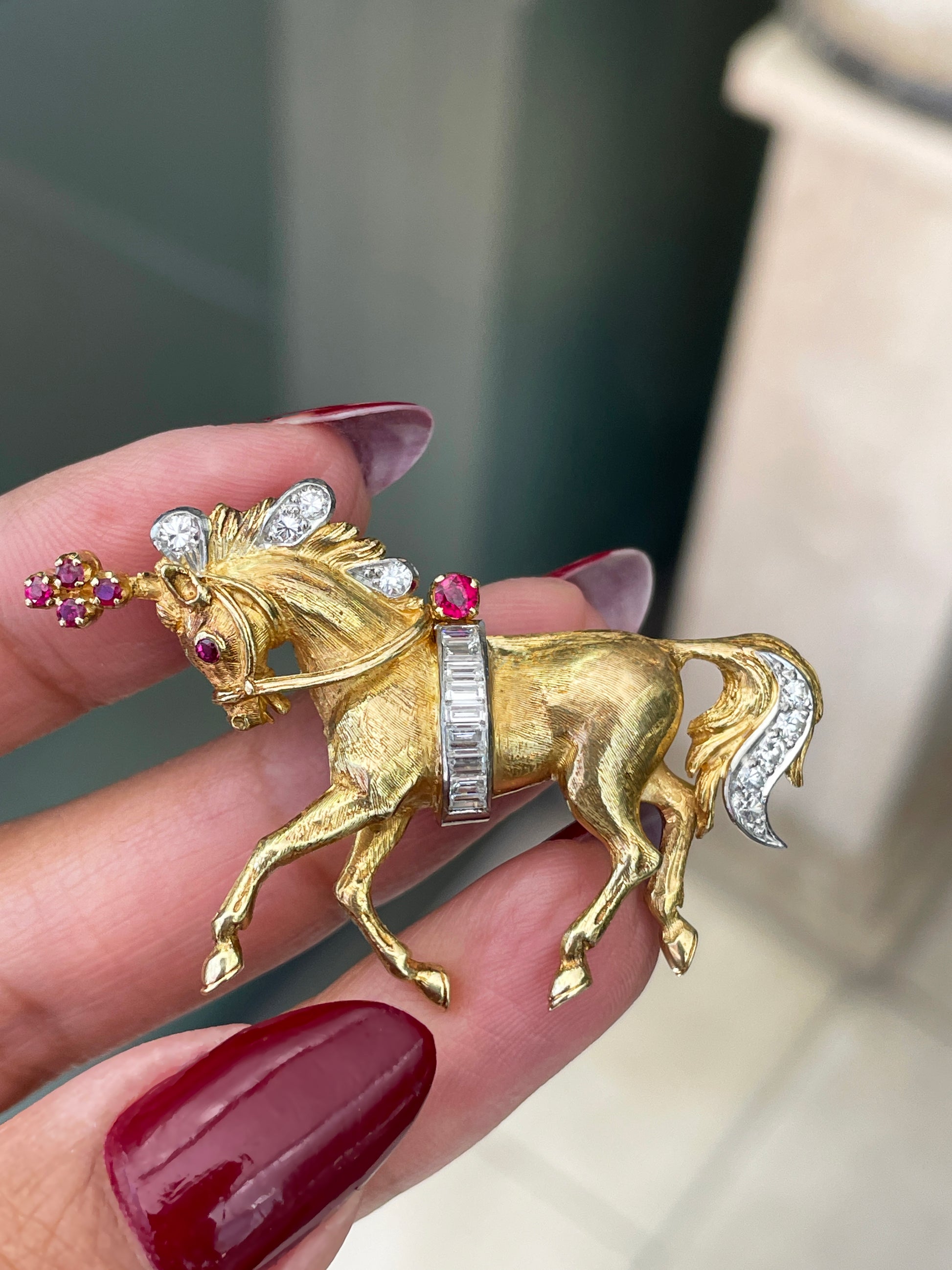 This wonderful horse brooch designed by British jeweller, Ben Rosenfeld is crafted in 18 carat yellow gold. The piece is set with 6 rubies. totalling to an approximate weight of 0.14 carats and further inlaid with 9 baguette cut diamonds and 9 round brilliant cut diamonds totalling to approximately 0.50 carats mounted in contrasting white gold. Stamped BRLTD. London Hallmark - 1961.