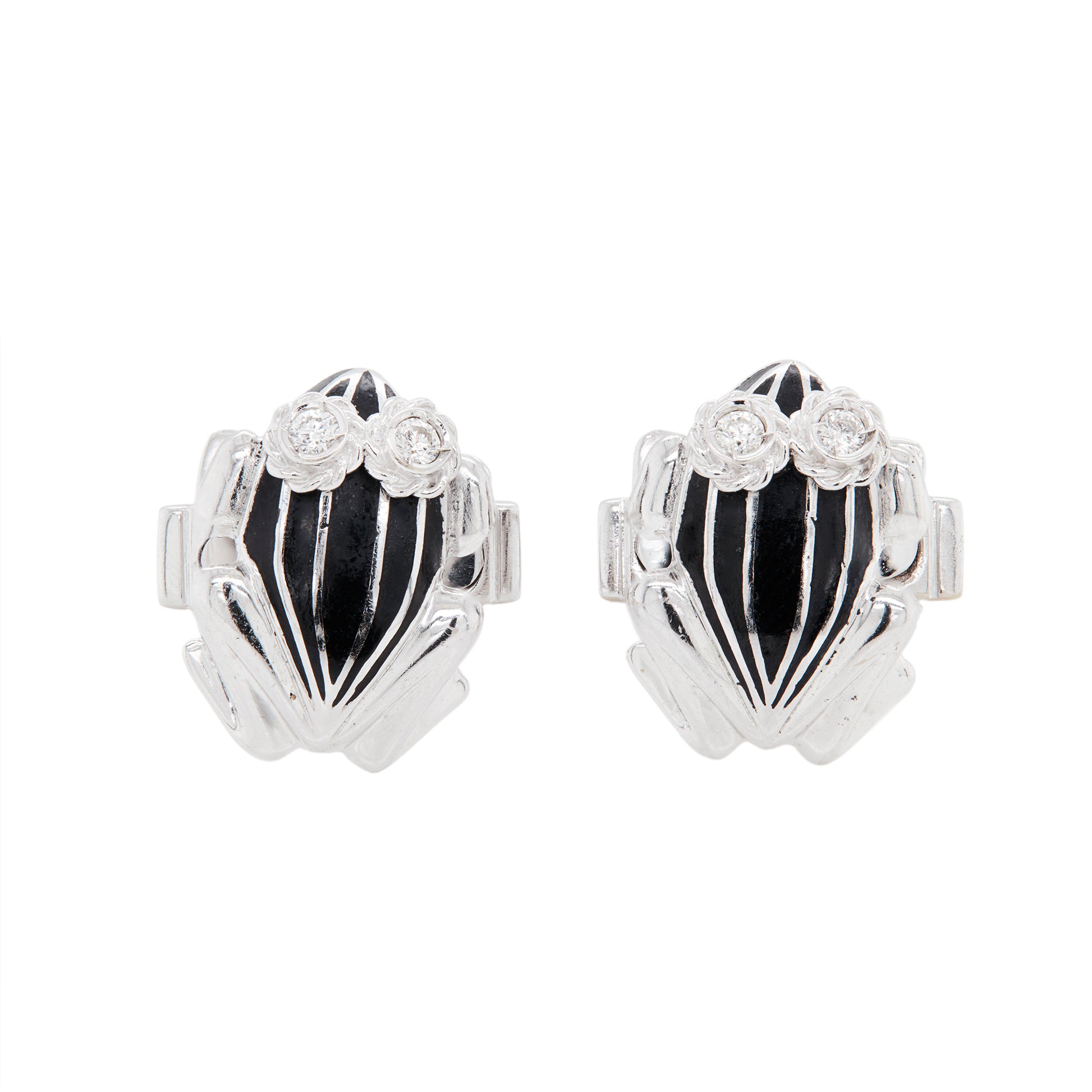 At the top sit two diamond set eyes, delicately mounted in flower shaped collet settings, with a combined weight of approximately 0.12ct across the pair. These floral settings are a particularly attractive detail, softening the overall look and lending a subtle decorative elegance that contrasts beautifully with the strong, architectural lines of the frogs' bodies.