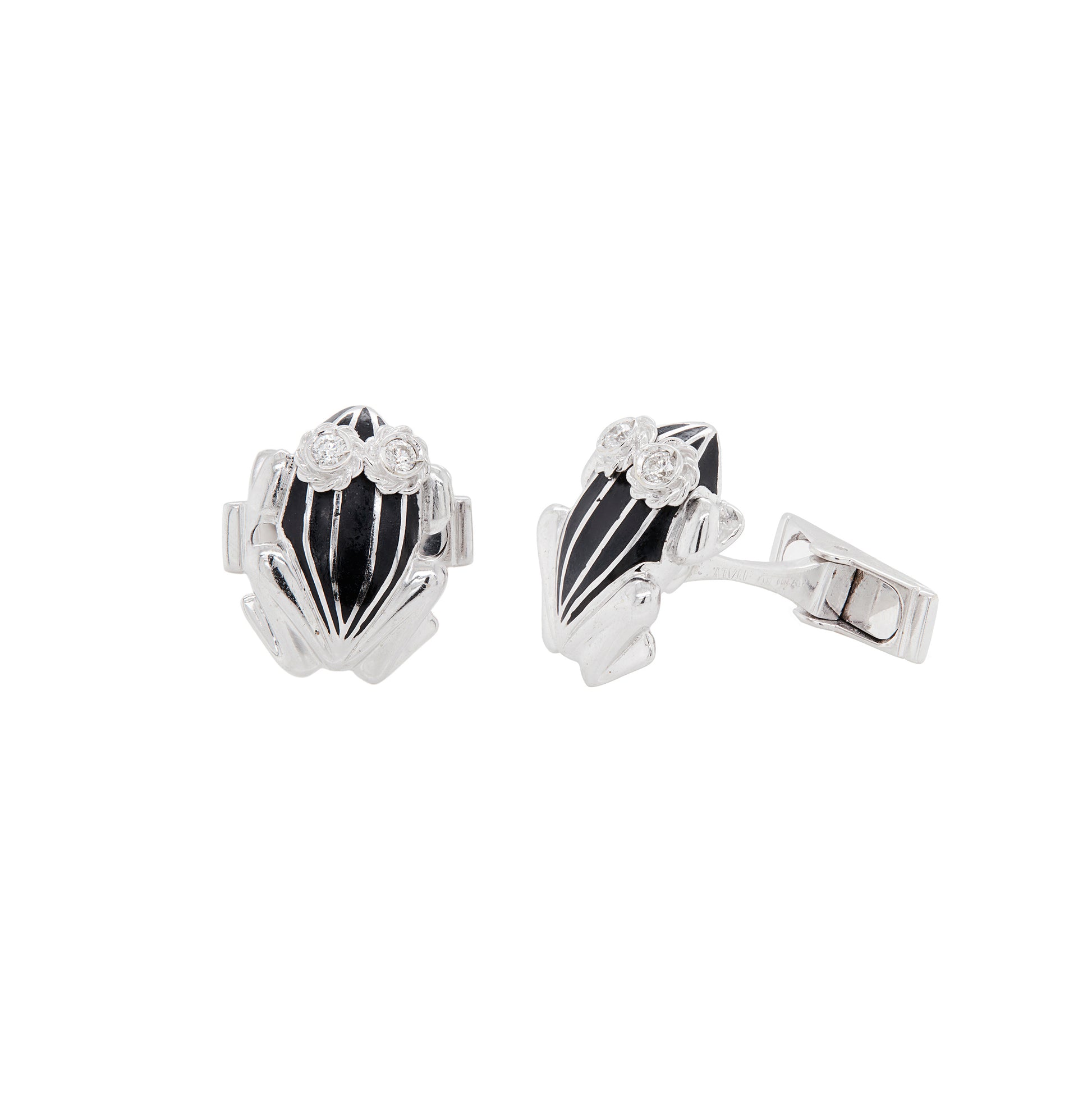 Finally, the cufflinks have a combined weight of 13.44 grams, with solid white gold swivel backs that allow them to sit neatly and securely on the cuff. Each frog measures approximately 1.7 x 1.3 cm. Stamped 750 ITALY 1150.