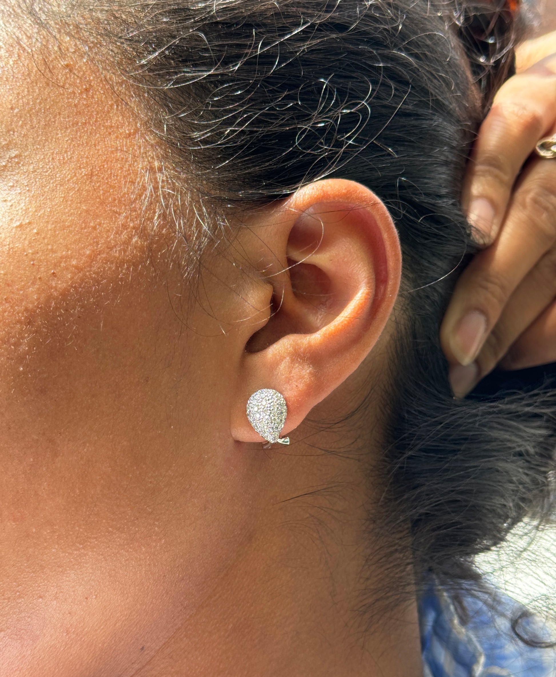 The luxurious pieces feature a beautiful teardrop shaped dome stud exquisitely inlaid with fine quality round brilliant cut diamonds, all grain set in open back settings.