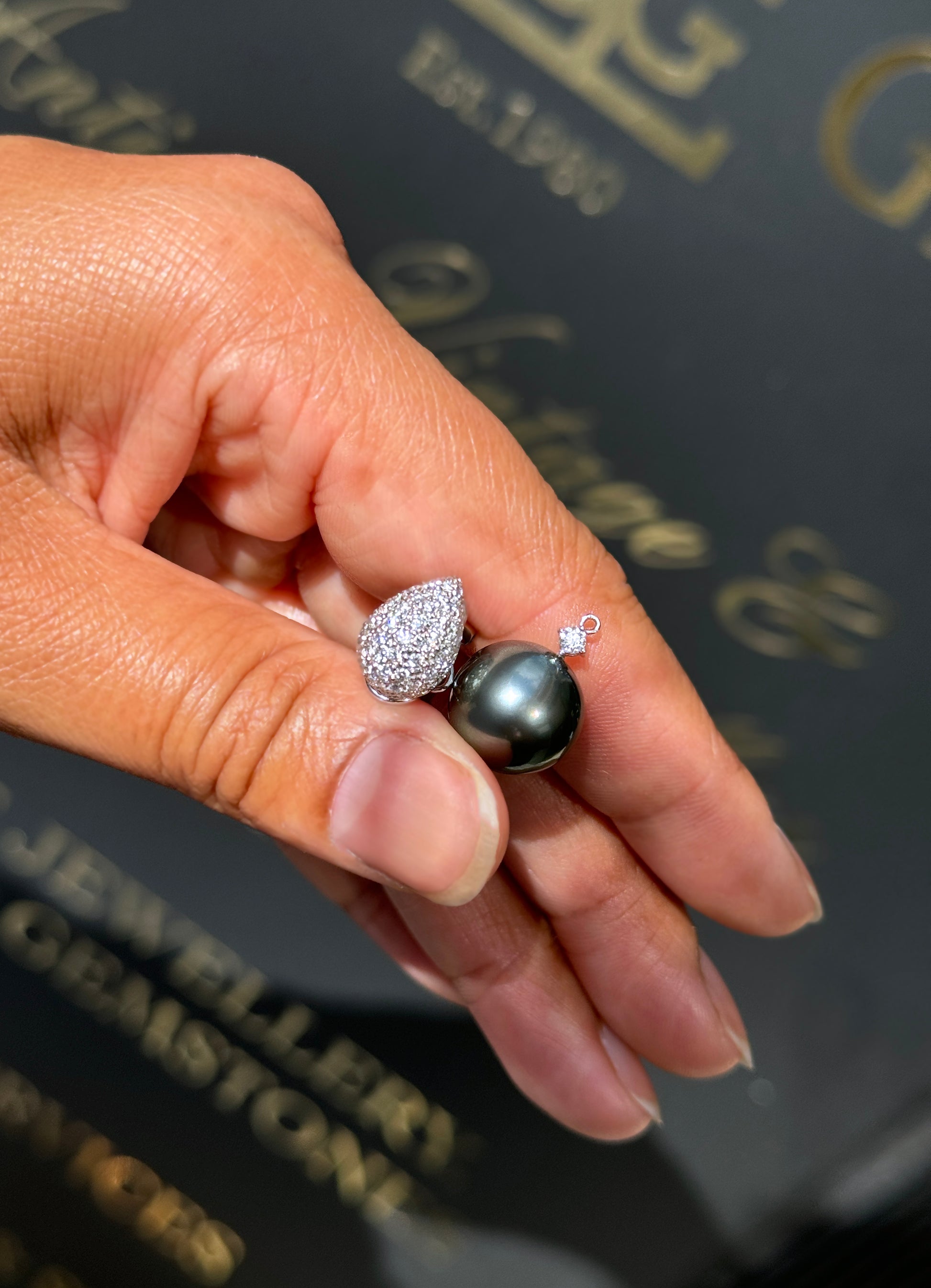Suspending gracefully from the solitaire diamonds and creating a fantastic contrast are two lustrous black pearls of a gorgeous dark grey colour, each measuring approximately 13mm in diameter.