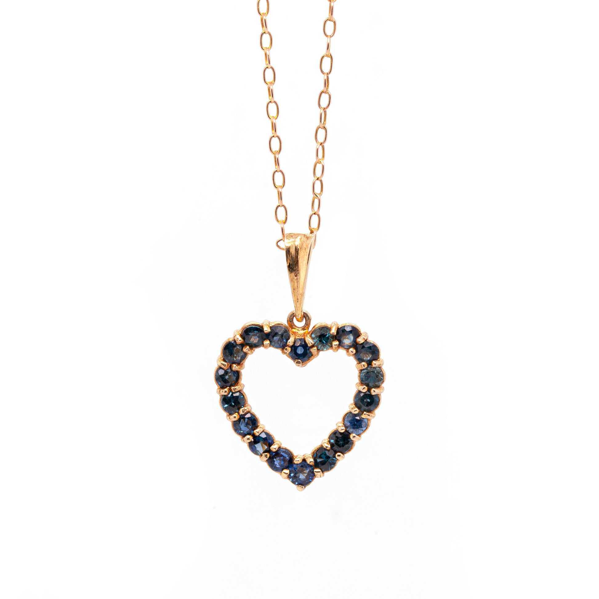 This lovely heart pendant is beautifully set with 18 round shaped blue sapphires, all mounted in 9ct yellow gold, open back settings. The pendant hangs from a fine 9 carat yellow gold link chain and weighs 3.5 grams.