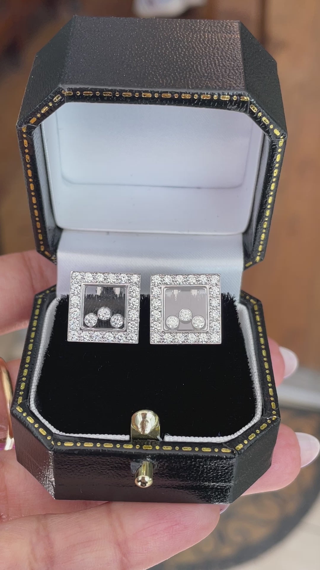 A pair of square shaped 18 carat white gold diamond earrings from Chopards' 'Happy Diamonds' collection. The square earrings are each inlaid with 20 round brilliant cut diamonds around the frame, surrounding the iconic Chopard signed glass encasing three floating diamonds. The diamonds have a total weight of approximately 0.77ct. The earrings measure 1.3cm x 1.3cm and have a gross weight of 16.55 grams, finished with a secure lever-back fastening.