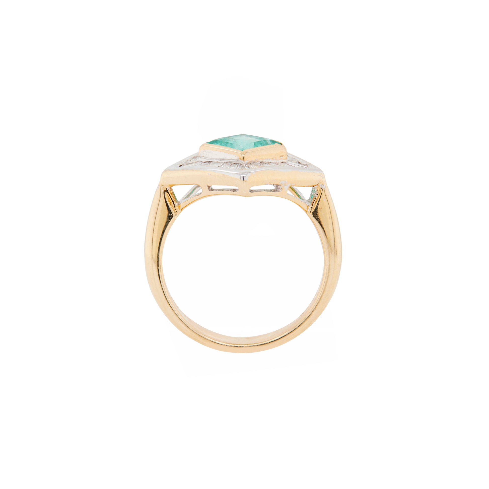 This 18 carat yellow and white gold dress ring is centred on a beautifully vibrant 1.30ct certified square Colombian emerald, set in a fine rubover mount, giving it a clean outline while allowing the stone itself to remain the focus.