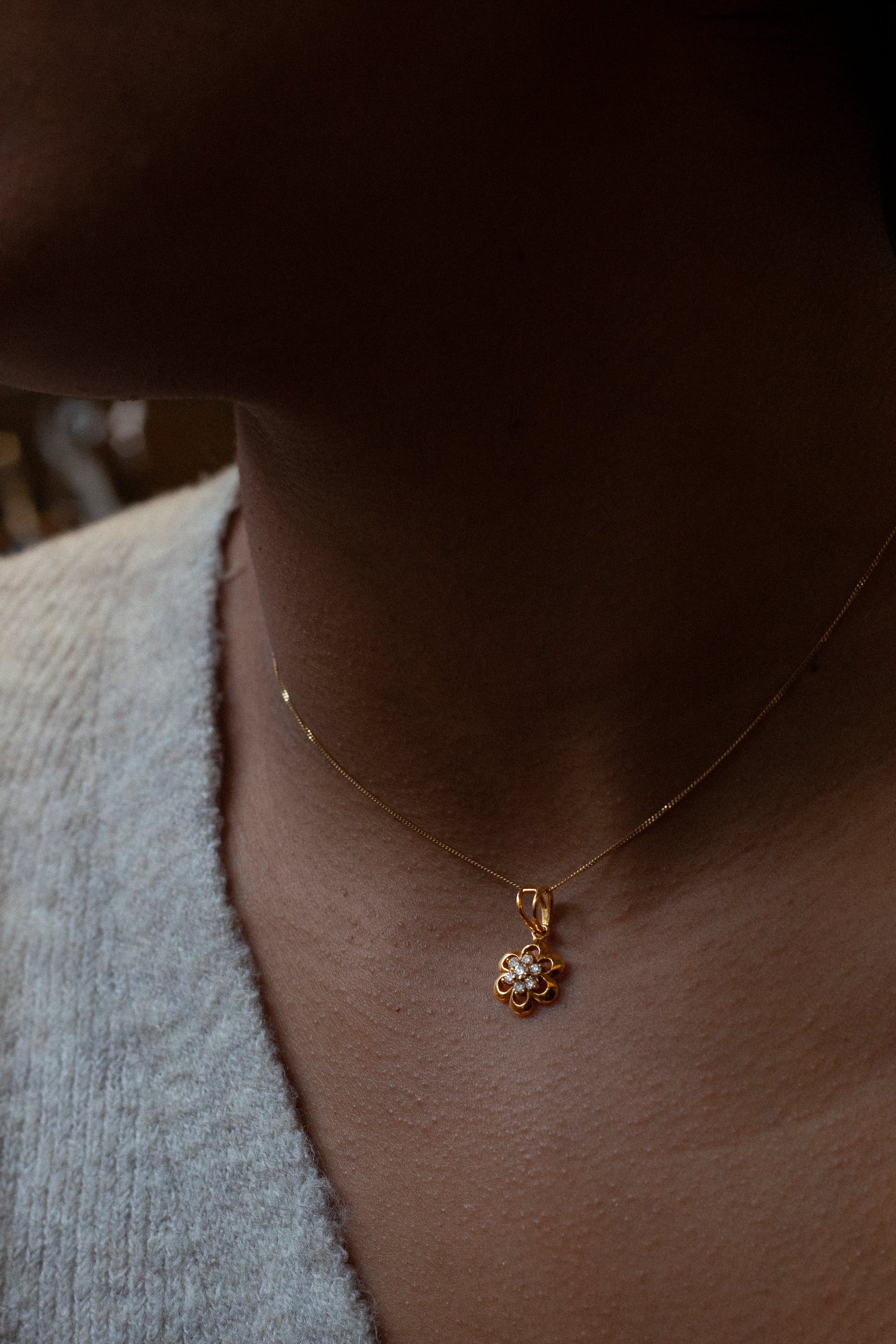 This lovely pendant portrays a delicate daisy flower designed with slightly curved openwork petals, finely crafted in 18 carat yellow gold.