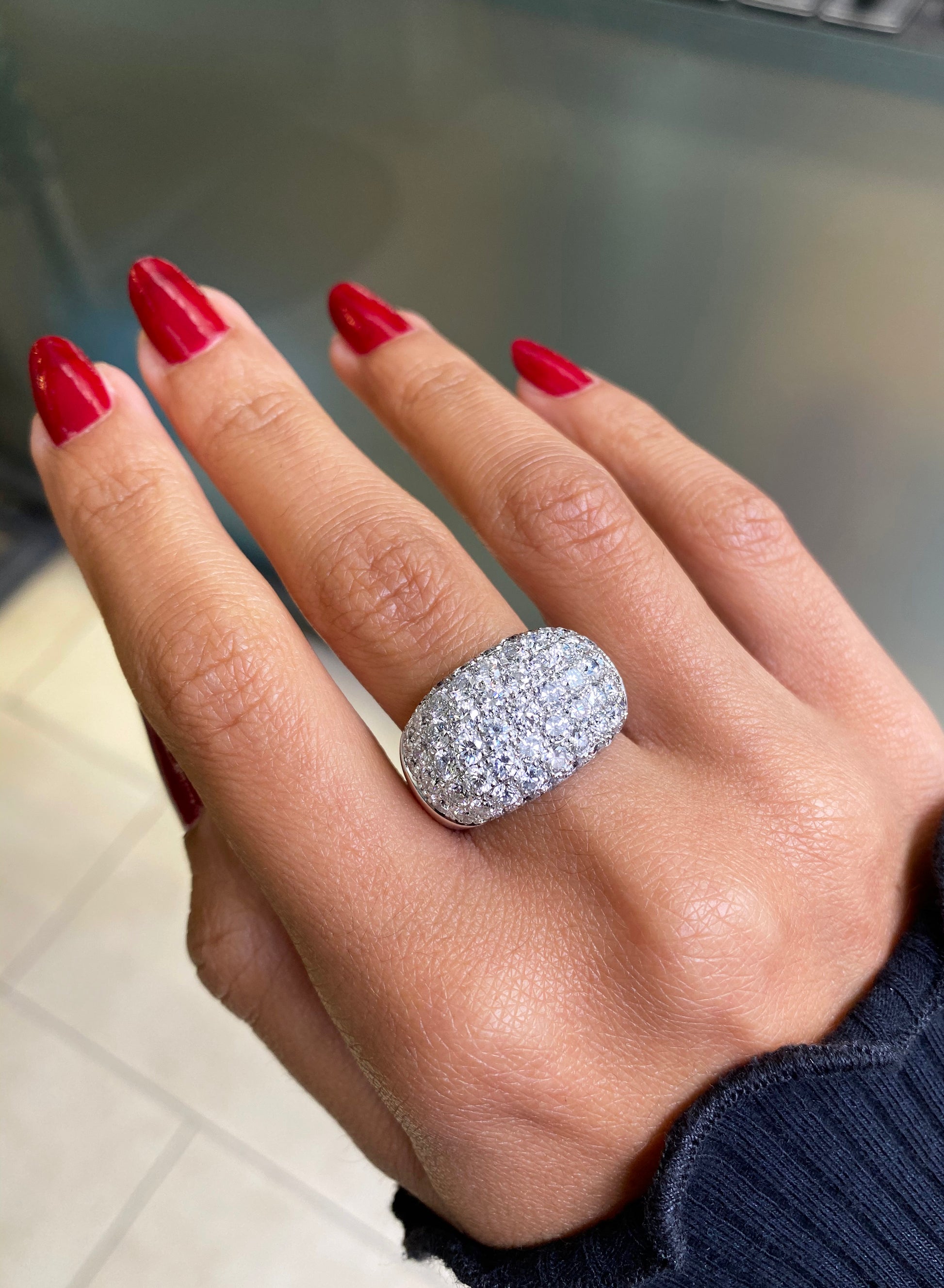 This stunning bombé cluster ring is set with 63 fine quality round brilliant cut diamonds coming to an approximate total weight of 4.50ct, all pavé set in an 18 carat white gold open back mount. The ring tapers from 6.5mm at the back to 14.3mm in the front and is beautifully finished with an openwork honeycomb motif inside. UK finger size 'O 1/2'.