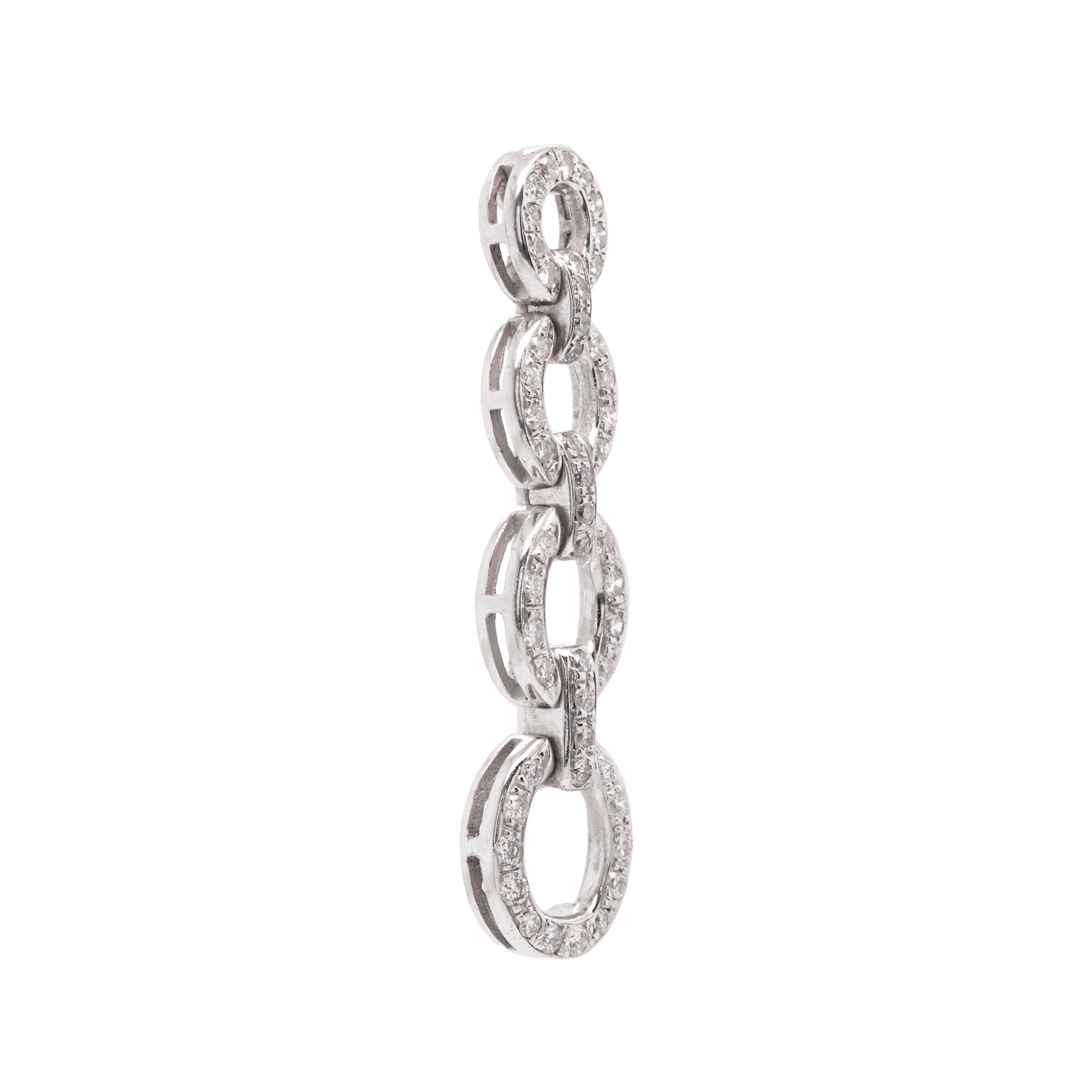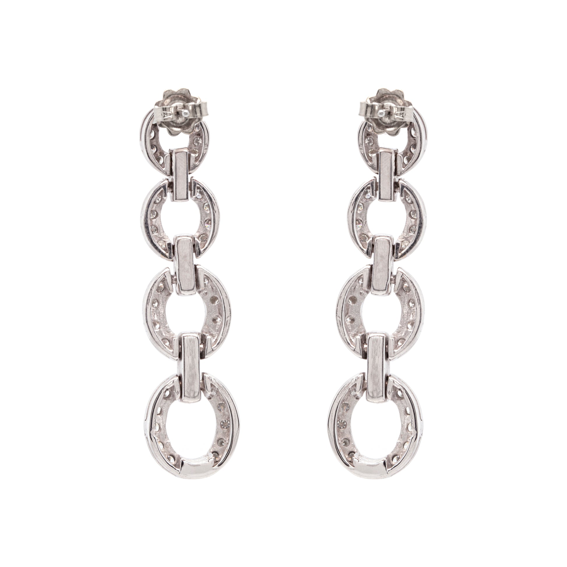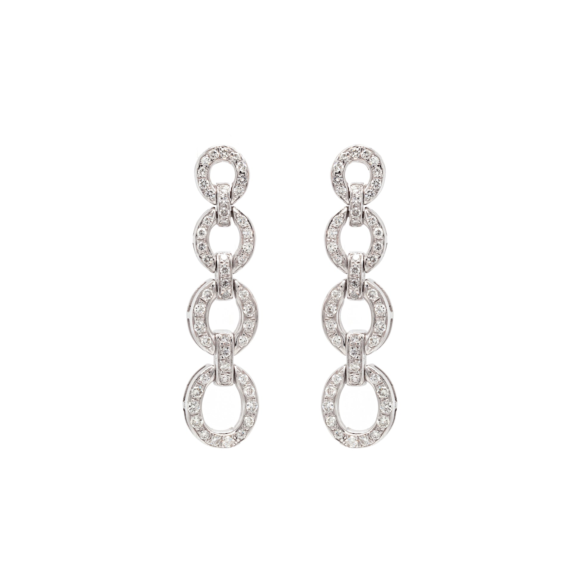 These exquisite 18 carat white gold earrings feature 4 graduating oval shaped links, beautifully alternating with bar links, all pavé set with fine quality round brilliant cut diamonds totalling to approximately 2.20ct. The delicate movements of the links catch and reflect the light in the most beautiful way making them the perfect pair of earrings to wear on a special occasion. Finally, the earrings measure 5.3cm in length, weight 22.9 grams combined and secure with an 18 carat white gold bar and butterfly. Tested 18K.