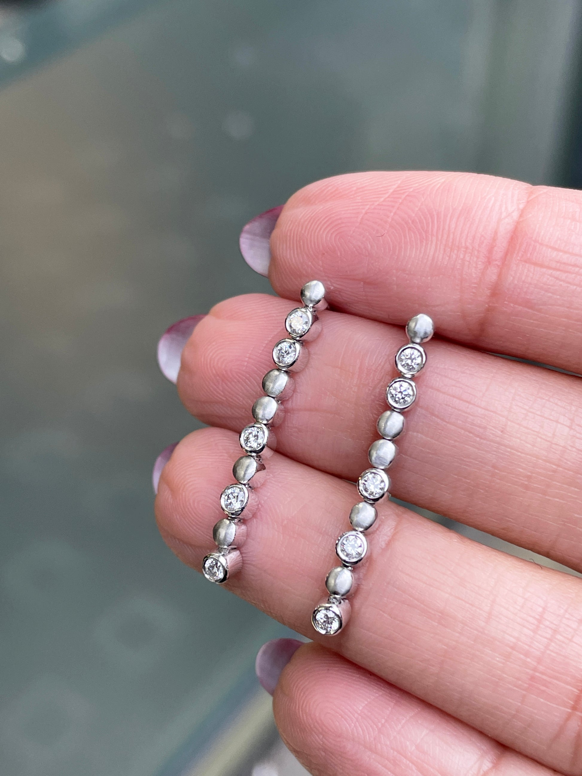 Beautiful and delicate, these linear drop earrings showcase 5 round brilliant cut diamonds, weighing approximately 0.60ct combined, all mounted in 18 carat white gold rub-over, open back settings. The sparkling diamonds alternate with five 18 carat white gold round shaped links featuring a perfect satin finish top. They measure 2.8cm in length and weigh 3.35 grams together. English hallmark.