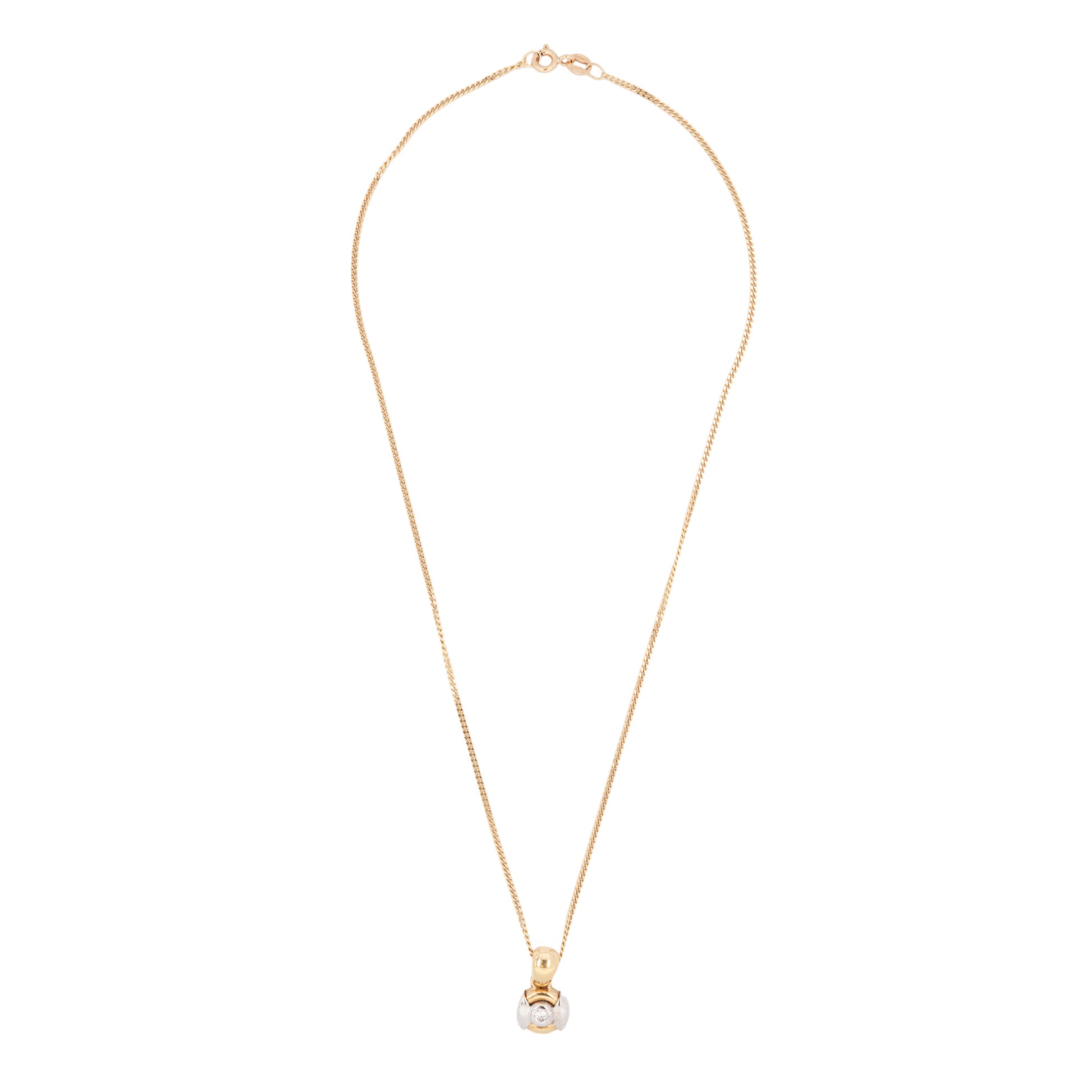 The pendant is finished with a smooth, yellow gold tapered bail and is suspended gracefully from a fine 16 inch curb link 18 carat yellow gold chain.