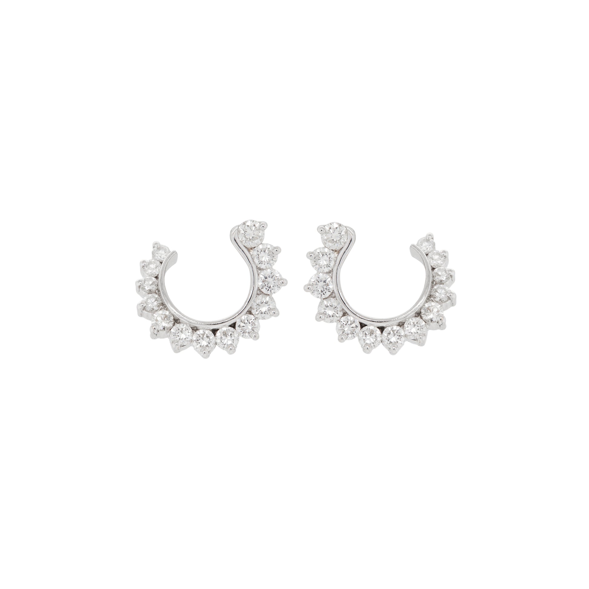 Crafted with meticulous attention to detail, each earring showcases a delicate and graceful swirl design, elegantly adorned with 13 fine quality graduated round brilliant cut diamonds. Together, the striking diamonds have a combined approximate weight of 1.36ct.