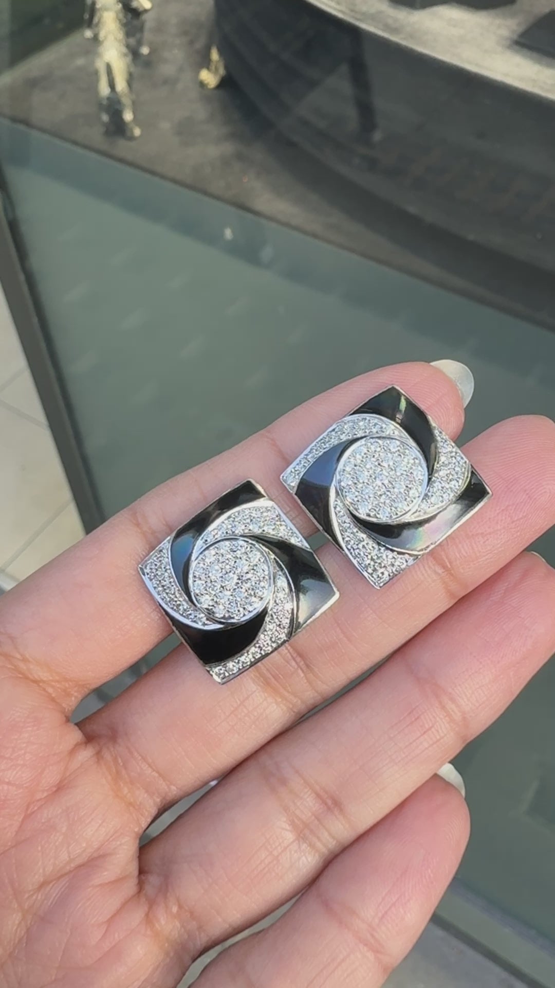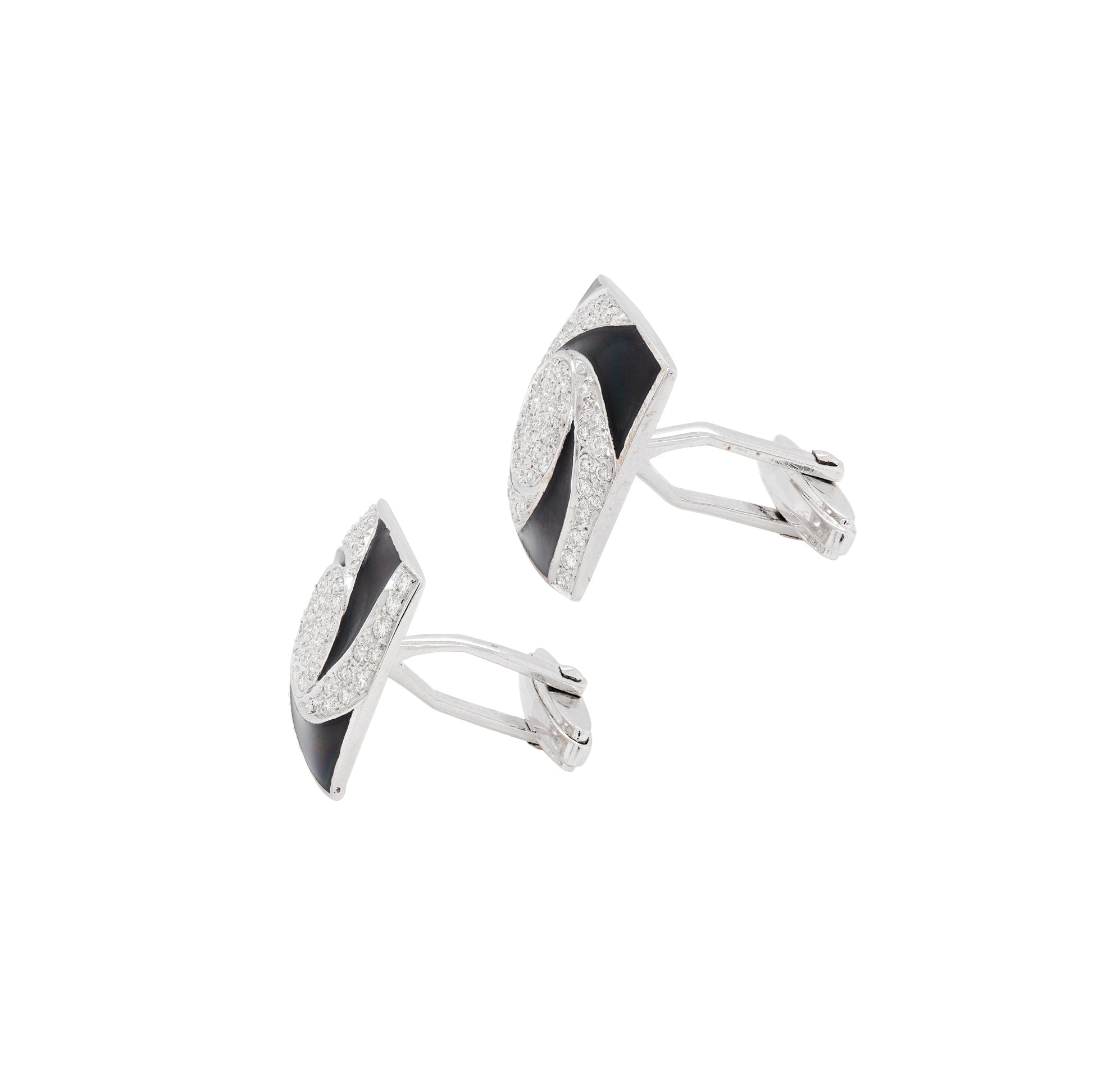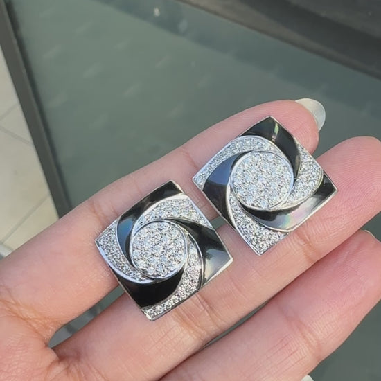 Each face is square in shape and measures approximately 19.25 x 19.25mm, with an intricate swirl design that brings a sense of movement to the front. The deep black enamel is smooth and glossy, curving through the centre and creating a hypnotic contrast against the pavé diamond set sections.