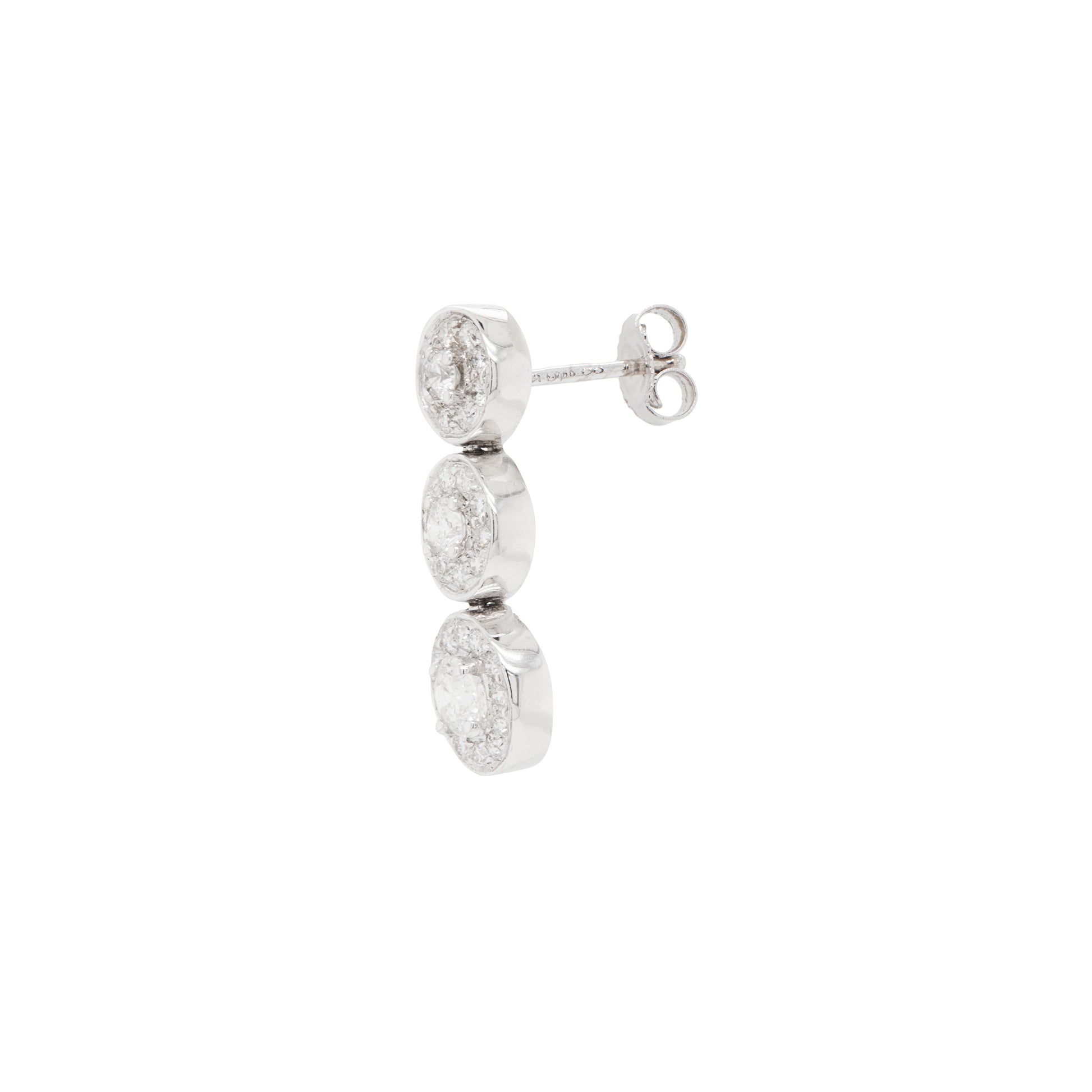 The earrings feature a wonderful trio of circular diamond clusters, perfectly aligned in a cascading design that gently graduates in size from top to bottom, making them a sophisticated choice for both formal and everyday attires.
