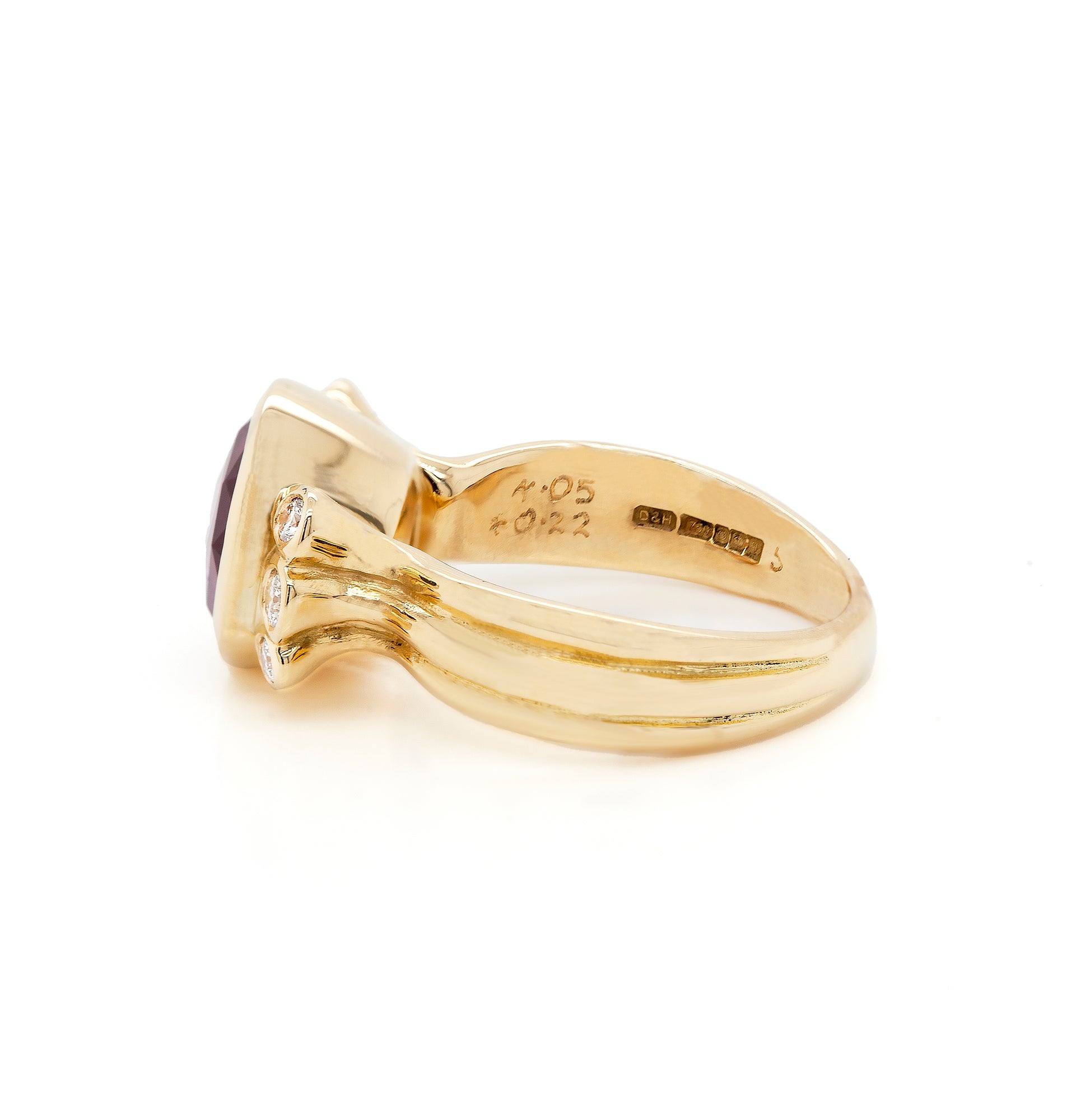 Flanking the reddish-pink gemstone on either side, are 3 rubover set fine quality round brilliant cut diamonds, with a total combined weight of 0.22ct, adding additional sparkle to the already eye catching piece.