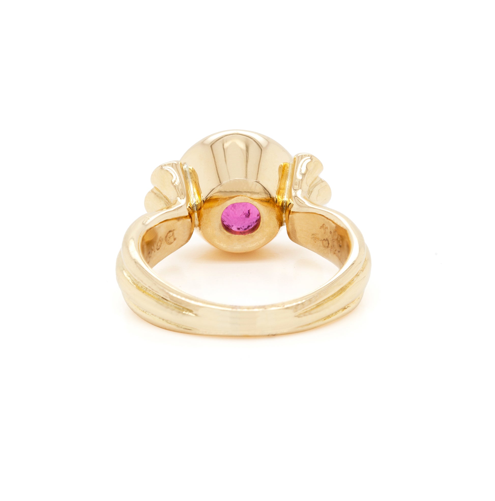 The charming ring features a vibrant and eye clean pink tourmaline, boasting an impressive weight of 4.05ct, skilfully rubover set in the centre of a sculptural designed high-polish mount.
