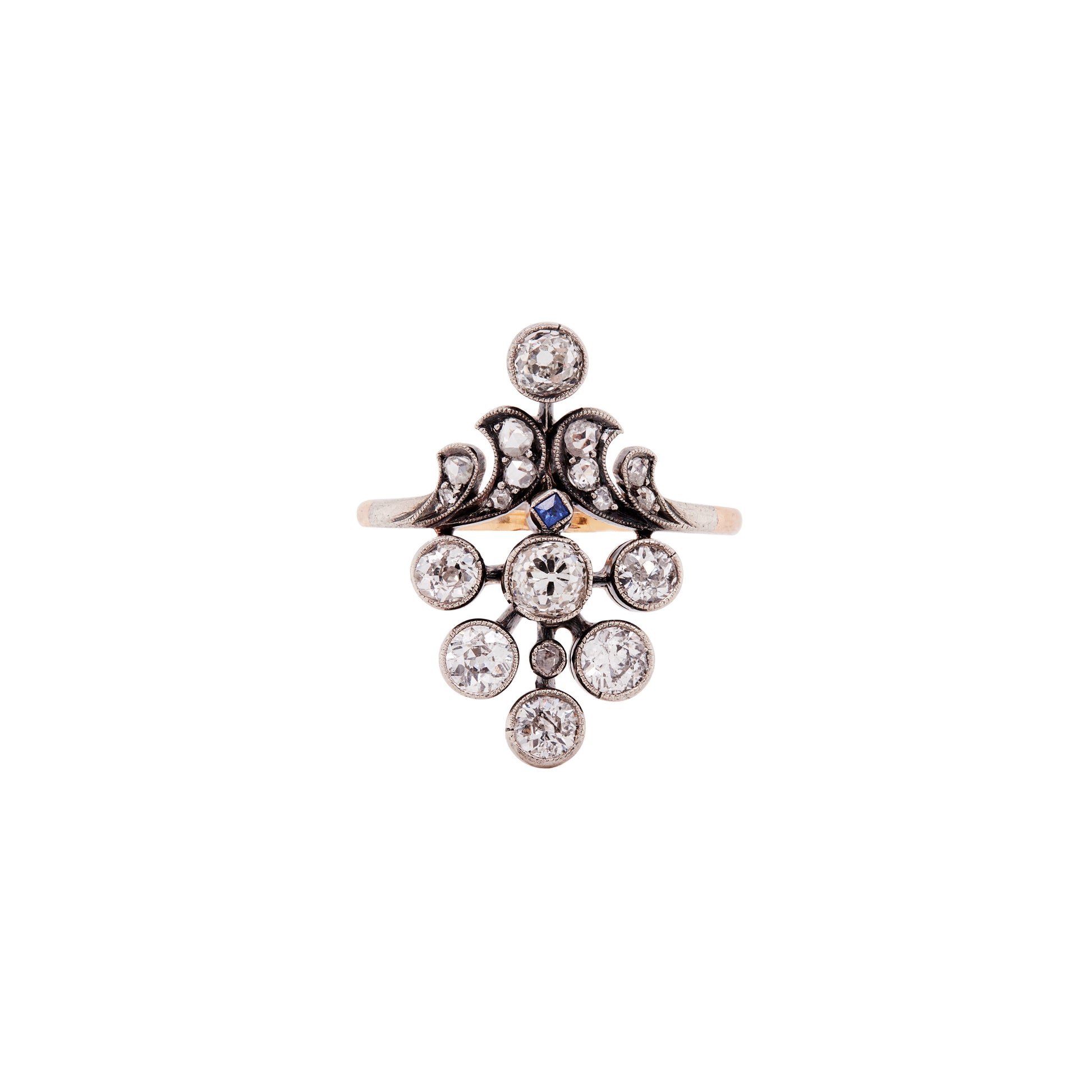 The piece rises upwards like a miniature chandelier. At the top sits a bright old mine cut diamond, followed by waved sections beautifully set with rose cut diamonds. Nestled between them is a tiny pop of colour - a deep blue square sapphire, set perfectly at the heart of the design. It's a subtle detail, but one that brings the whole piece to life, adding contrast and a touch of regal charm.