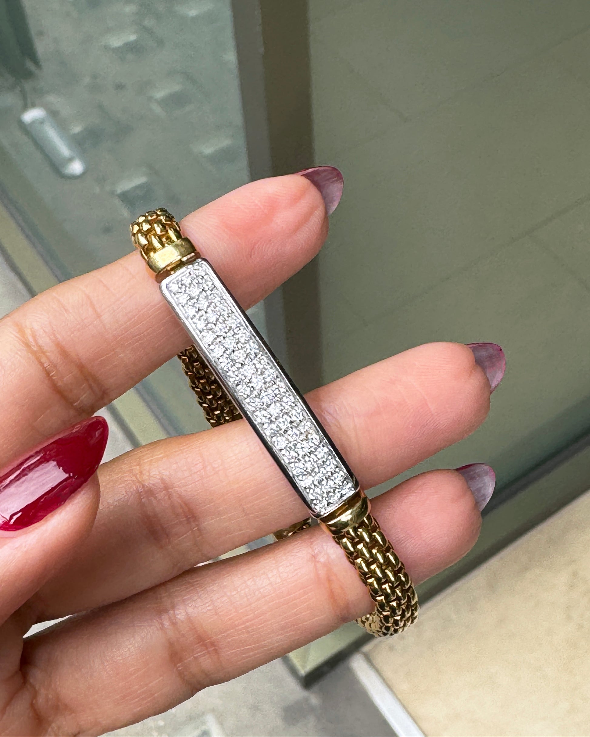 Complementing the piece is FOPE's signature mesh-link thick chain, which is made of luxurious yellow gold and is perfectly connected to the central bar, thus allowing the bracelet to be worn comfortably.