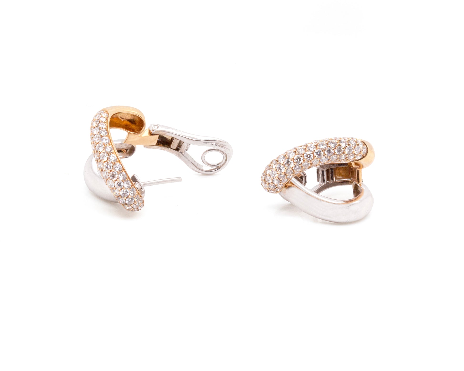 The rose gold half of each earring is beautifully inlaid with a dazzling array of fine quality round brilliant cut diamonds, weighing approximately 2.80ct combined, meticulously set in multiple rows, catching the light from every angle and creating a striking contrast to the high polish white gold half.