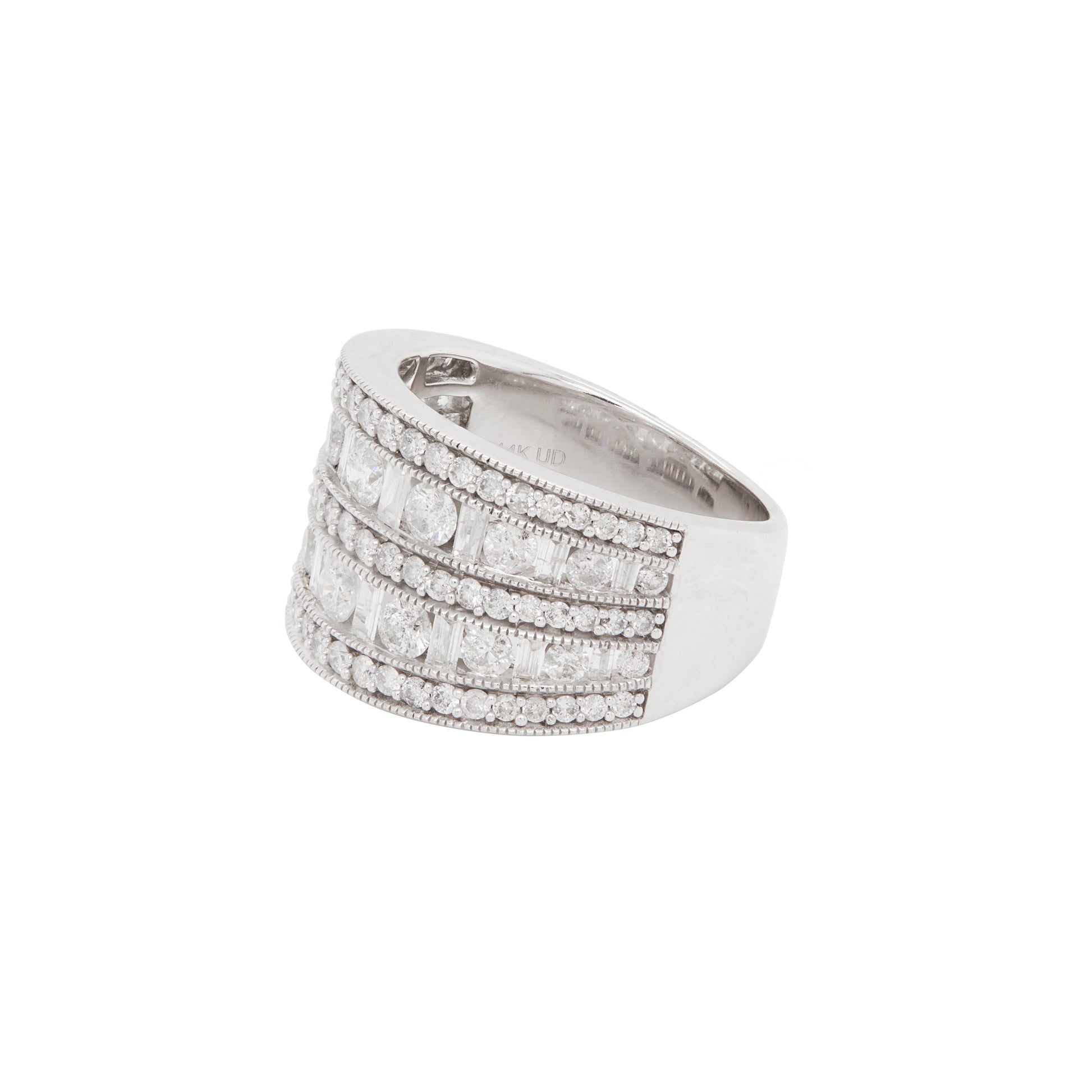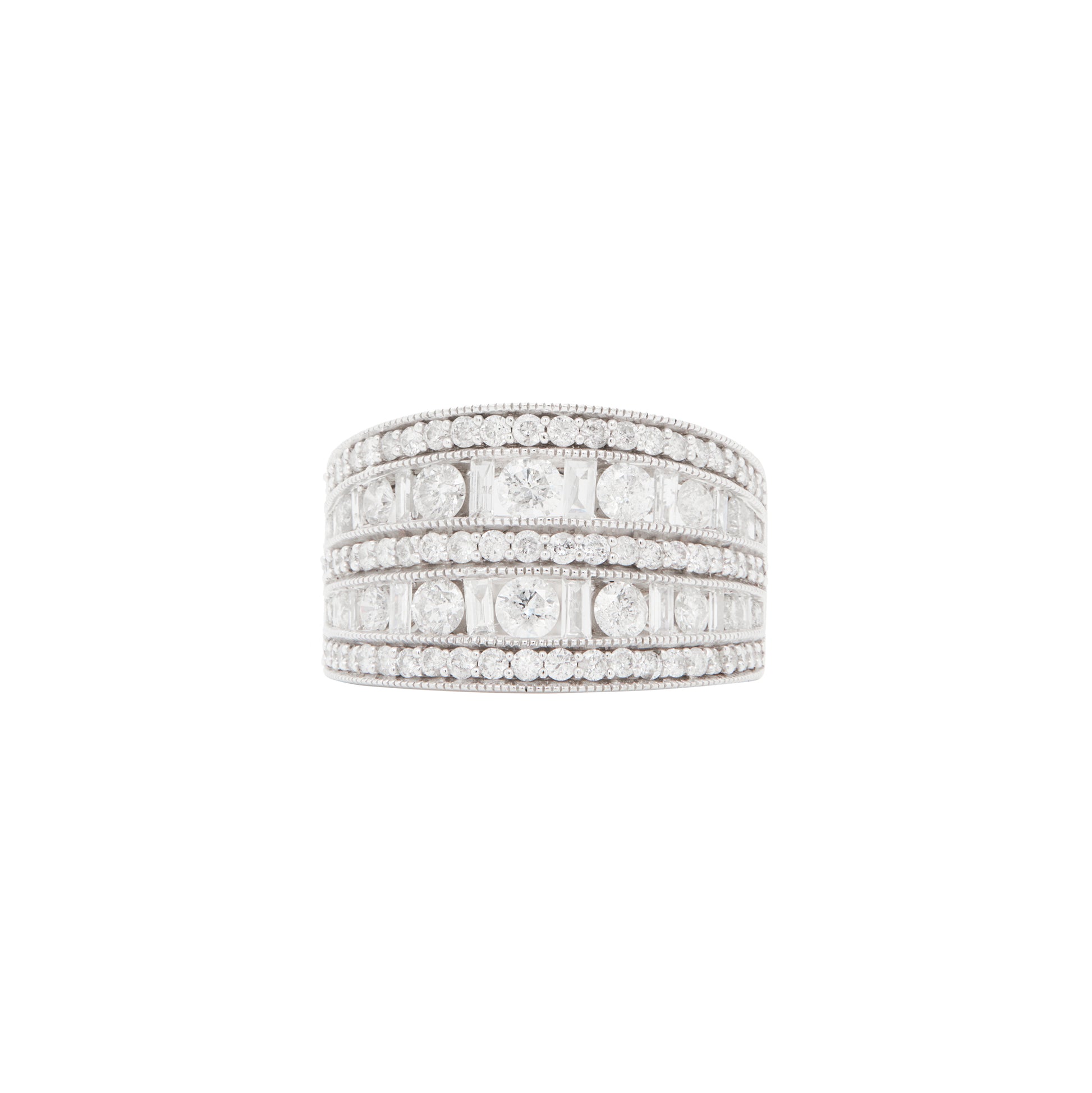 The scintillating diamond rows are beautifully divided by delicate millgrain borders, adding a touch of vintage charm to the piece.