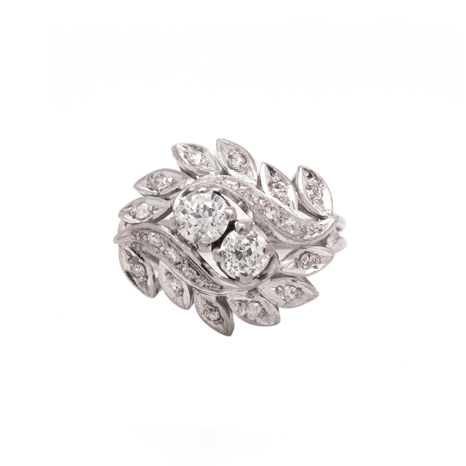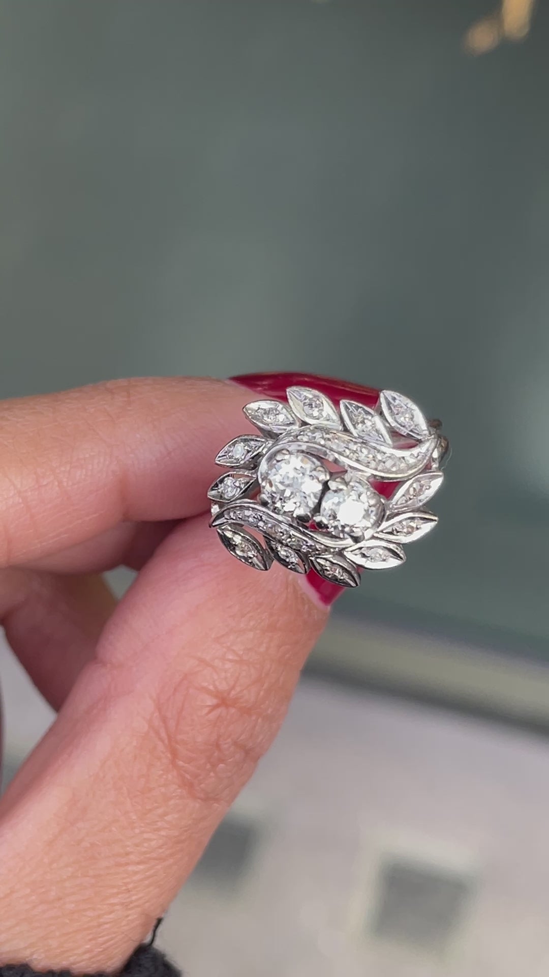 This wonderful cocktail ring showcases an elevated leaf-shaped design set in the centre with two old cut diamonds, mounted in four claw, open back settings. The ring is further designed with two twisted bands and delicate leaves, all inlaid with eight cut diamonds, beautifully highlighting the centre stones, bringing the total approximate diamond weight to 1.10ct. Meticulously crafted, this intricate piece captures the essence of nature's delicate beauty and sits 11.3mm proud of the finger. Tested 14K. UK finger size 'K'.