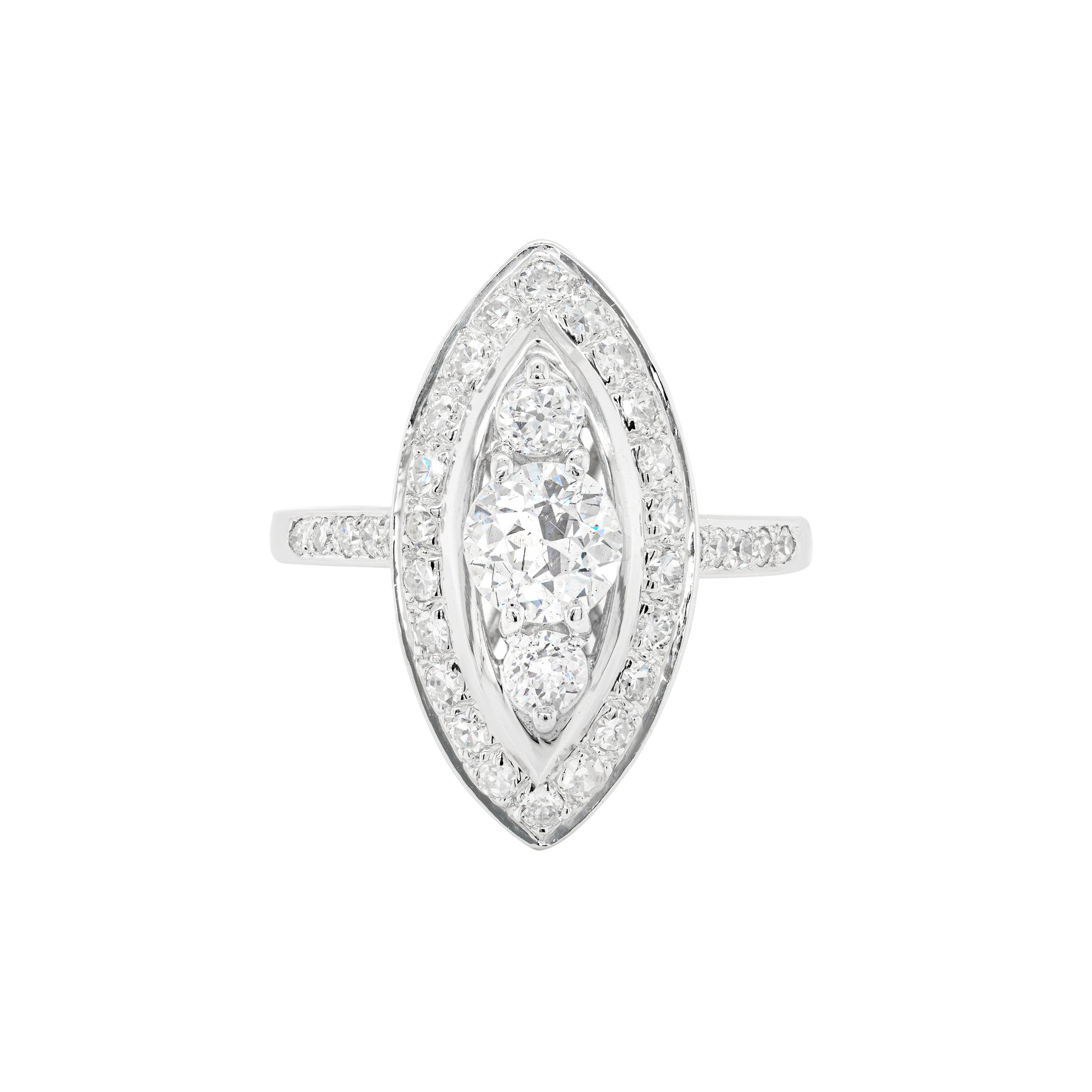 Marquise shaped dress ring featuring an old cut diamond weighing 0.87ct in the centre with two old cut diamonds vertically on either side with a combined weight of 0.30ct in open back claw settings. The ring's border is grain set with 22 eight cut diamonds and further set with 5 grain set eight cut diamonds on each shoulder with a combined weight of approximately 0.40ct all mounted in platinum. UK finger size 'Q'.