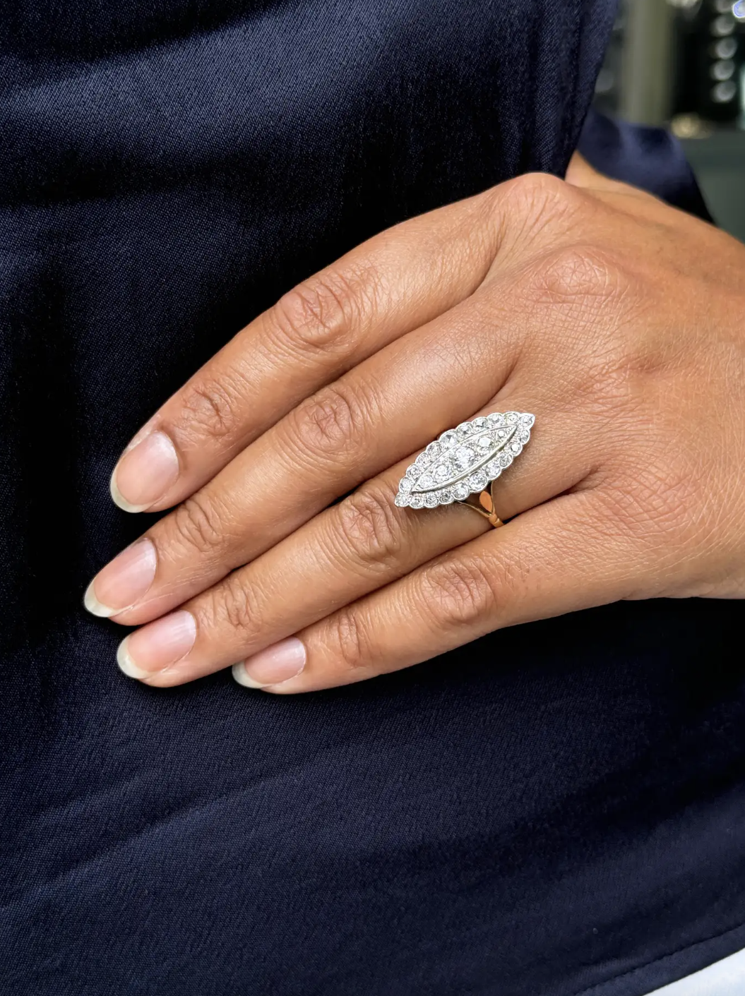 The fantastic ring showcases an elongated marquise-shaped design, which is gracefully adorned with a striking cluster of graduating old mine cut diamonds, totalling to approximately 2.20ct combined.
