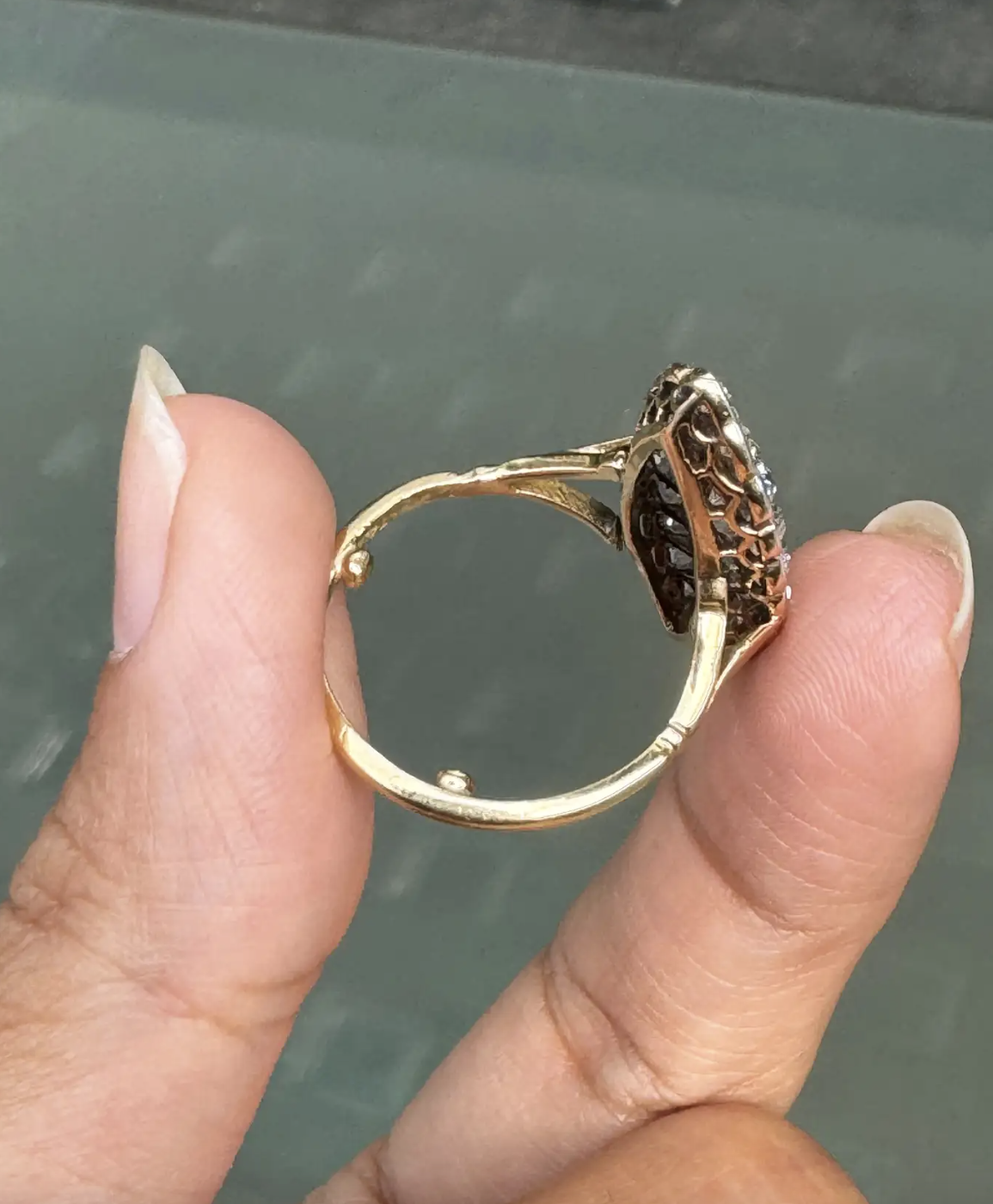 An absolutely magnificent antique navette ring, masterfully crafted in buttery 18ct yellow gold and cool platinum.