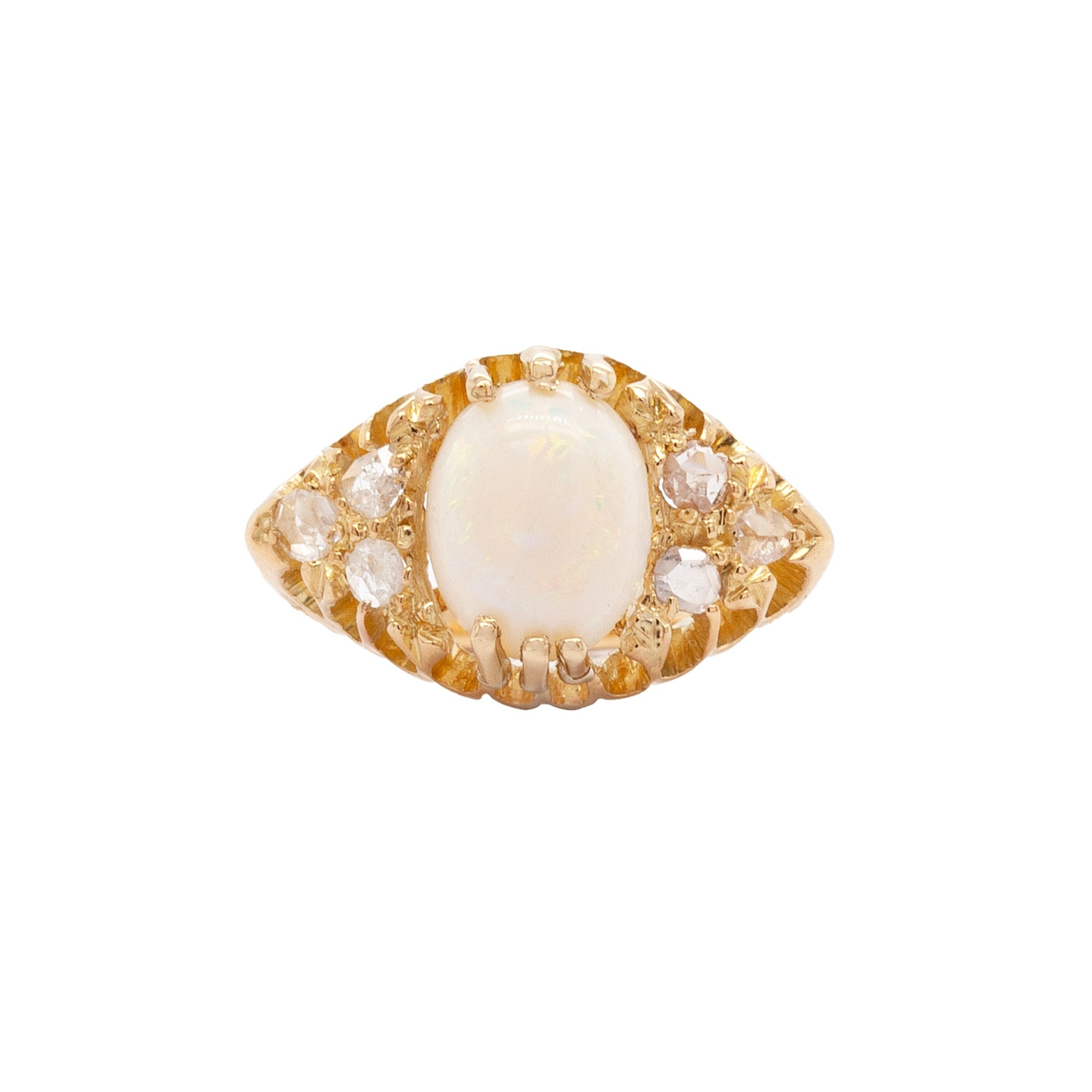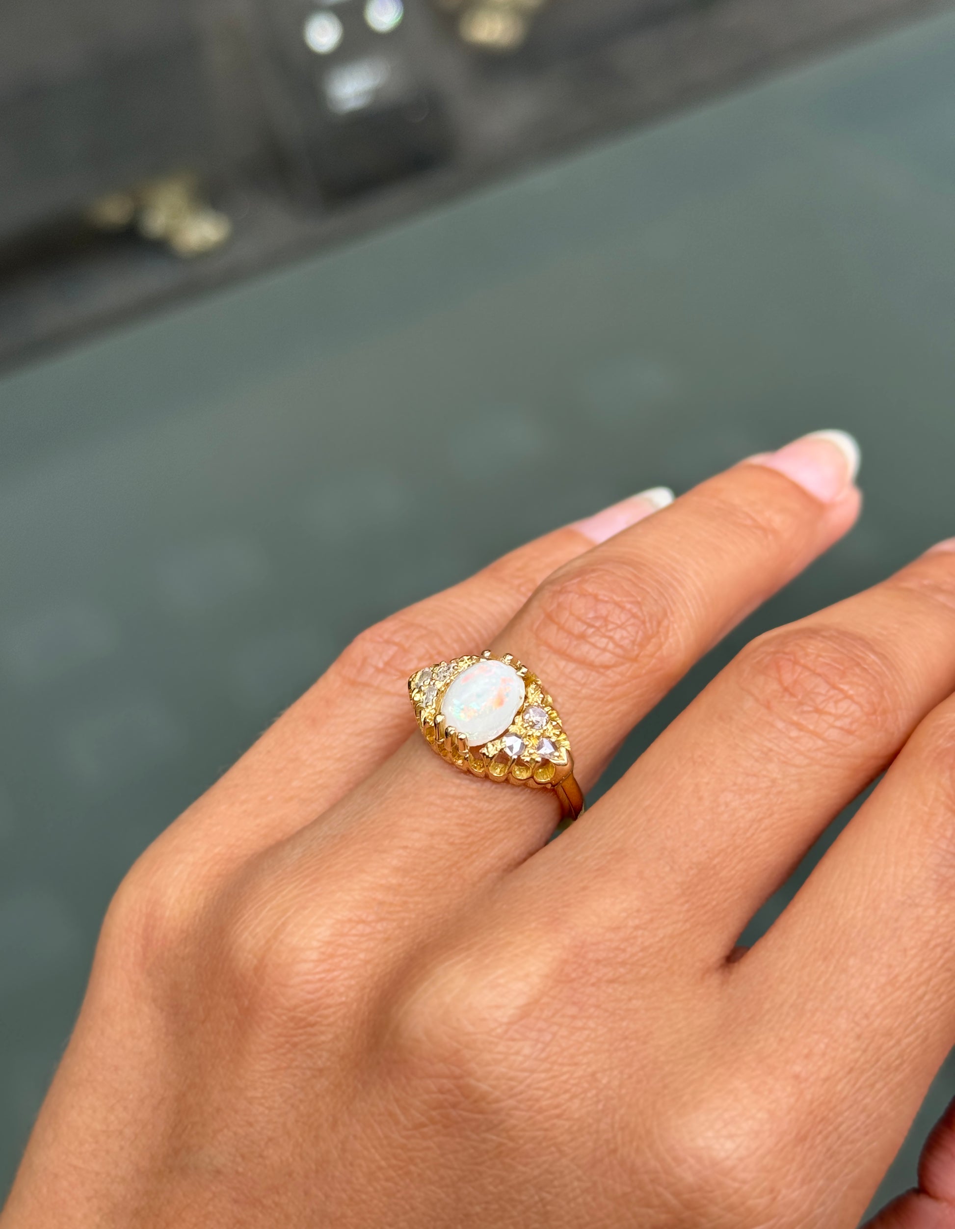 This charming antique ring exudes sophistication and timeless elegance, featuring a mesmerising 9x7 mm opal as its centrepiece.