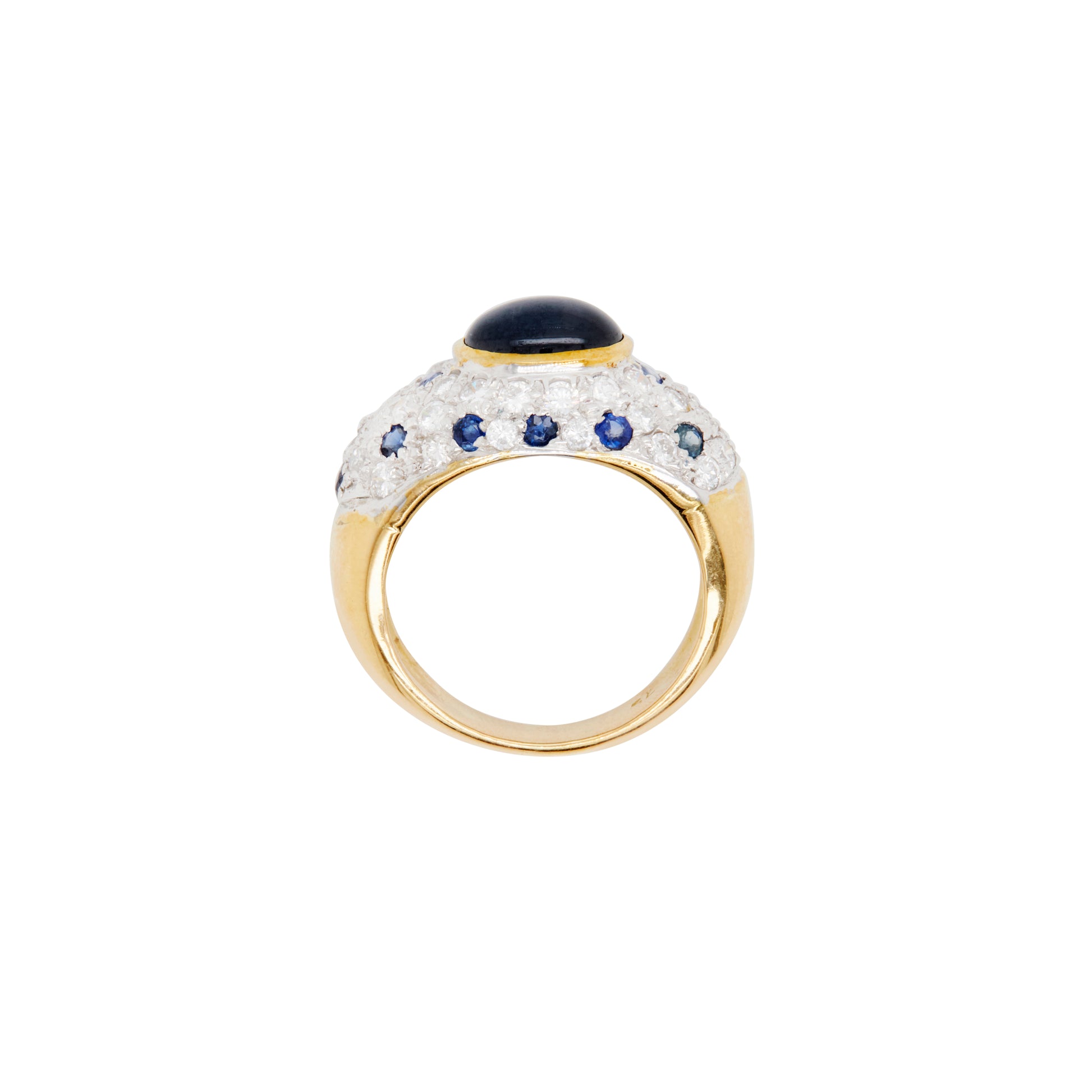 At its centre sits proudly a smooth oval cabochon sapphire, measuring approximately 9 x 7.2mm, displaying a deep midnight blue tone and secured within a yellow gold rub-over setting, which creates a delicate frame and provides a warm contrast against the cooler tones surrounding it.
